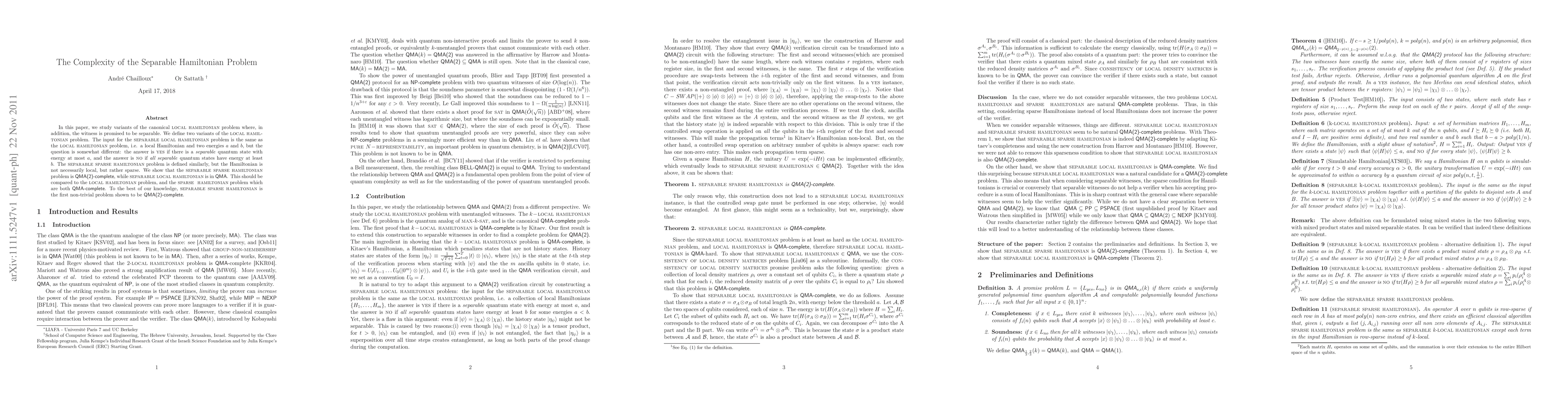 This paper explores the Separable Hamiltonian problem, defining two variants: Separable-Local-Hamiltonian and Separable-Sparse-Hamiltonian. It demonstrates that the Separable-Sparse-Hamiltonian problem is QMA(2)-Complete, marking the first non-trivial QMA(2)-Complete problem identified.