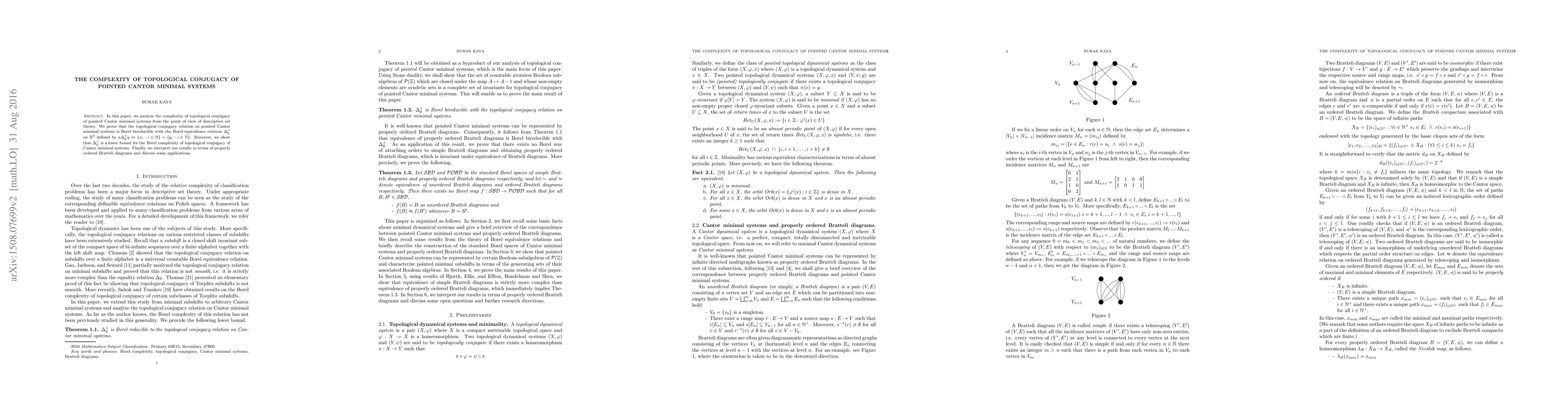 This paper investigates the complexity of topological conjugacy in pointed Cantor minimal systems using descriptive set theory, proving that it is Borel bireducible with the $\Delta_{\mathbb{R}}^+$ relation on $\mathbb{R}^{\mathbb{N}}$, and discusses its implications through properly ordered Bratteli diagrams.