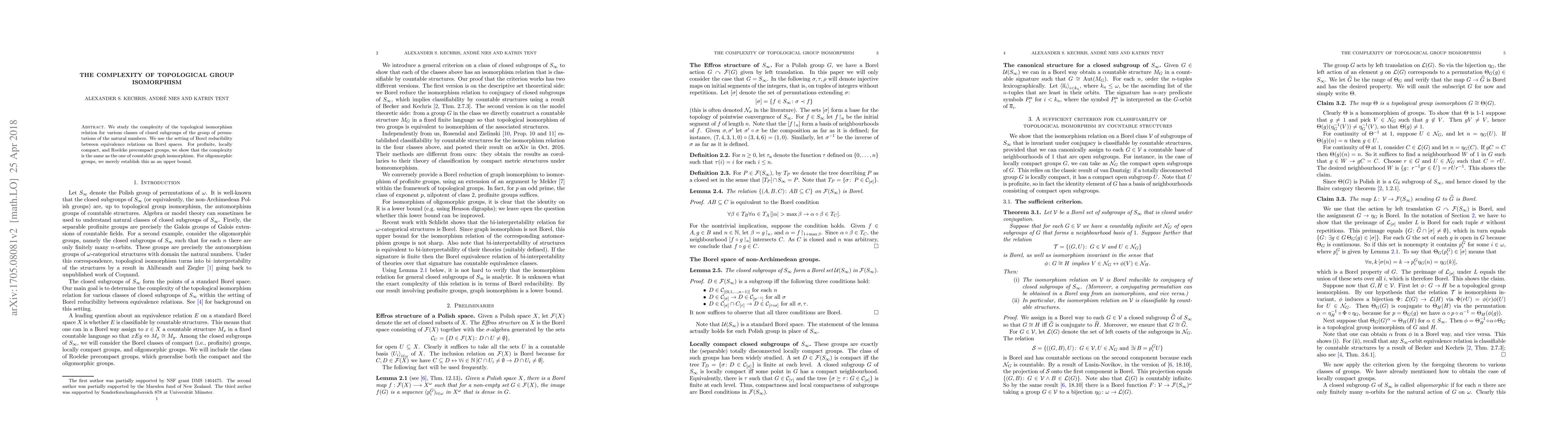 This paper investigates the complexity of isomorphism for closed subgroups of permutation groups, showing that for profinite, locally compact, and Roelcke precompact groups, the complexity matches that of countable graph isomorphism. For oligomorphic groups, it establishes an upper bound for the complexity, which is not definitive due to the Borel nature of the relation.