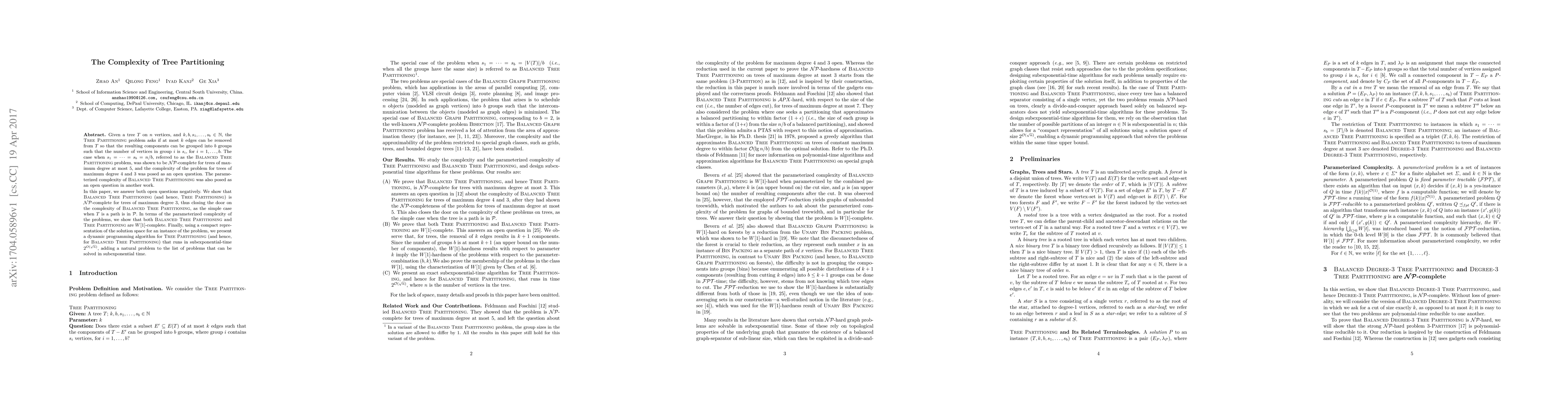 Given a tree $T$ on $n$ vertices, and $k, b, s_1, \ldots, s_b \in N$, the Tree Partitioning problem asks if at most $k$ edges can be removed from $T$ so that the resulting components can be grouped into $b$ groups such that the number of vertices in group $i$ is $s_i$, for $i =1, \ldots, b$. The case when $s_1=\cdots =s_b =n/b$, referred to as the Balanced Tree Partitioning problem, was shown to be NP-complete for trees of maximum degree at most 5, and the complexity of the problem for trees of maximum degree 4 and 3 was posed as an open question. The parameterized complexity of Balanced Tree Partitioning was also posed as an open question in another work. In this paper, we answer both open questions negatively. We show that Balanced Tree Partitioning (and hence, Tree Partitioning) is NP-complete for trees of maximum degree 3, thus closing the door on the complexity of Balanced Tree Partitioning, as the simple case when $T$ is a path is in P. In terms of the parameterized complexity of the problems, we show that both Balanced Tree Partitioning and Tree Partitioning are $W[1]$-complete. Finally, using a compact representation of the solution space for an instance of the problem, we present a dynamic programming algorithm for Tree Partitioning (and hence, for Balanced Tree Partitioning) that runs in subexponential-time $2^{O(\sqrt{n})}$, adding a natural problem to the list of problems that can be solved in subexponential time.