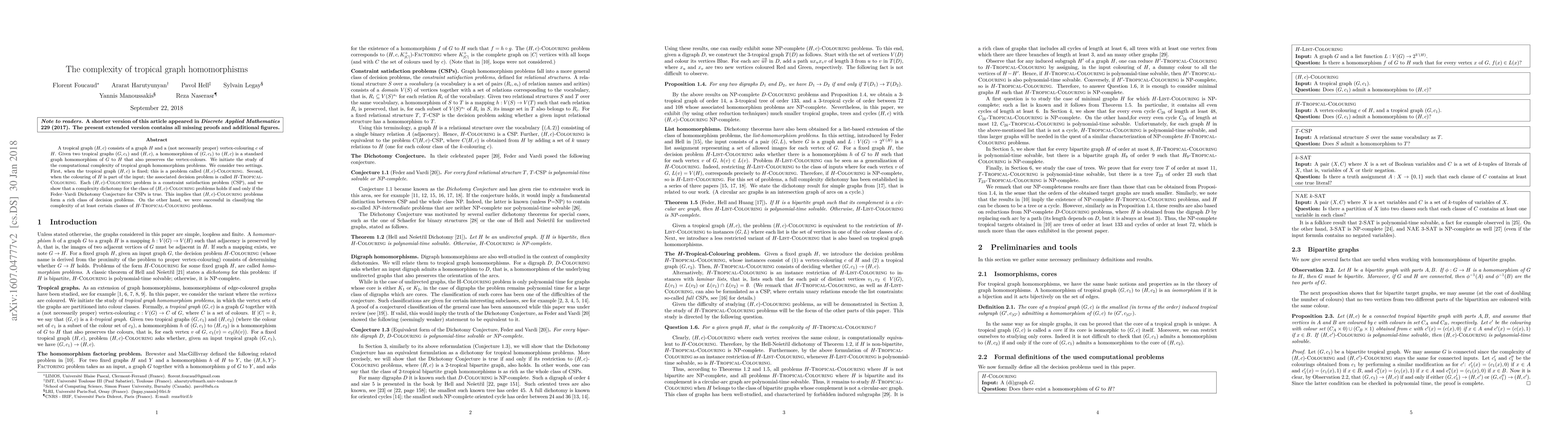 The paper investigates the complexity of tropical graph homomorphisms, showing that certain problems are decidable with a specific dichotomy, while others have been classified in terms of complexity.