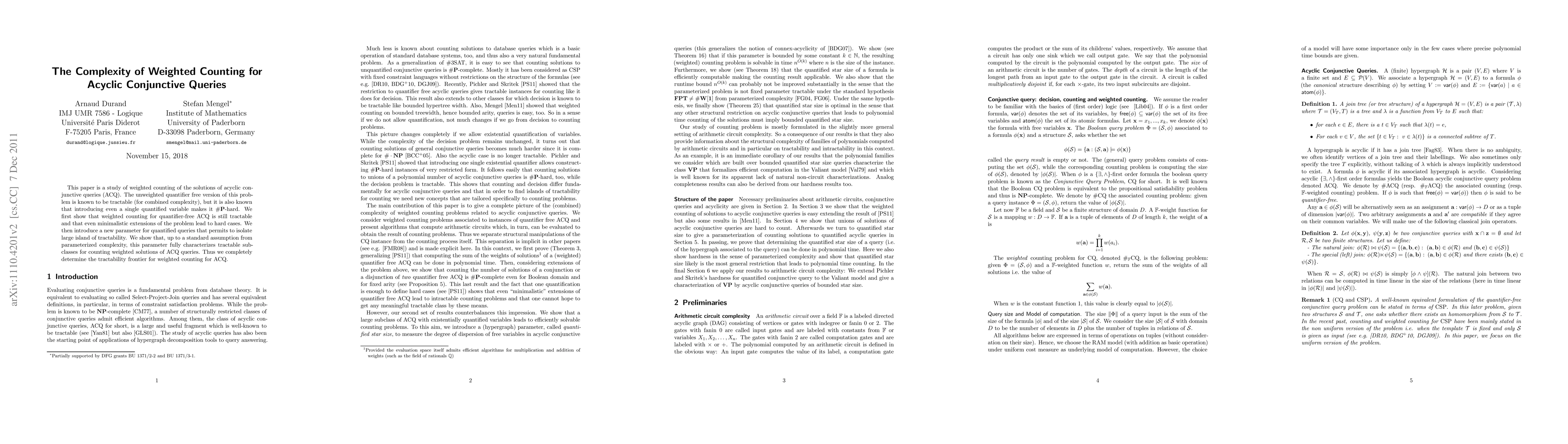 This paper investigates the complexity of weighted counting for acyclic conjunctive queries ($\ACQ$), demonstrating that while quantifier-free versions remain tractable, introducing quantified variables leads to $\sP$-hard problems. The authors introduce a new parameter to identify tractable subclasses, fully characterizing the boundary of tractability for weighted counting of $\ACQ$ queries.