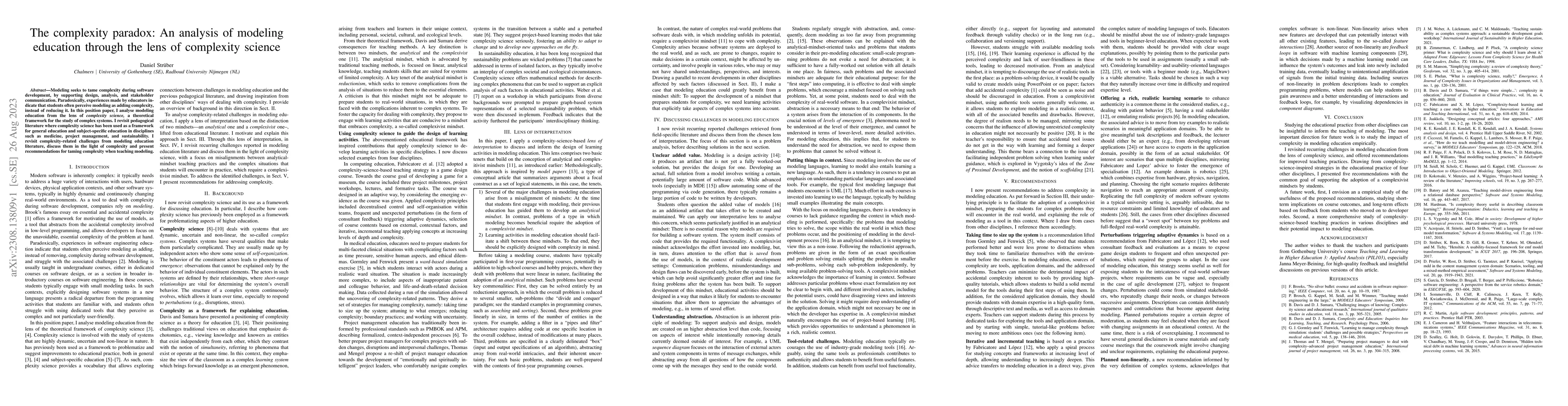 This paper explores the paradox of modeling education through complexity science, revealing that students often find modeling more complex than simplifying. It reviews literature on complexity science in education and proposes strategies to better manage complexity in teaching modeling.