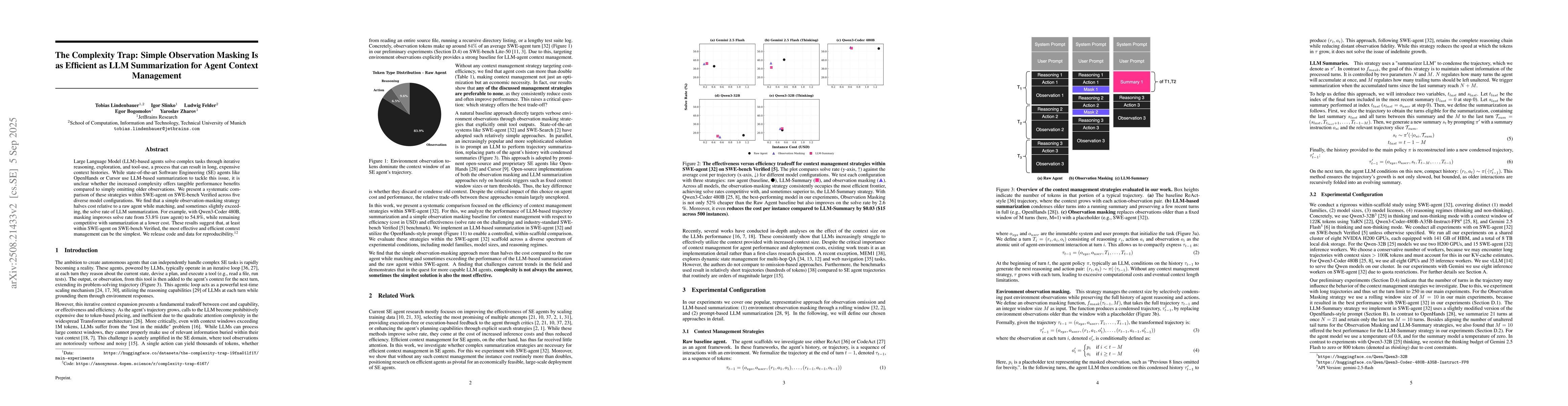Large Language Model (LLM)-based agents solve complex tasks through iterative reasoning, exploration, and tool-use, a process that can result in long, expensive context histories. While state-of-the-art Software Engineering ( SE) agents like OpenHands or Cursor use LLM-based summarization to tackle this issue, it is unclear whether the increased complexity offers tangible performance benefits compared to simply omitting older observations. We present a systematic comparison of these strategies within SWE-agent on SWE-bench Verified across five diverse model configurations. We find that a simple observation-masking strategy halves cost relative to a raw agent while matching, and sometimes slightly exceeding, the solve rate of LLM summarization. For example, with Qwen3-Coder 480B, masking improves solve rate from 53.8% (raw agent) to 54.8%, while remaining competitive with summarization at a lower cost. These results suggest that, at least within SWE-agent on SWE-bench Verified, the most effective and efficient context management can be the simplest. We release code and data for reproducibility