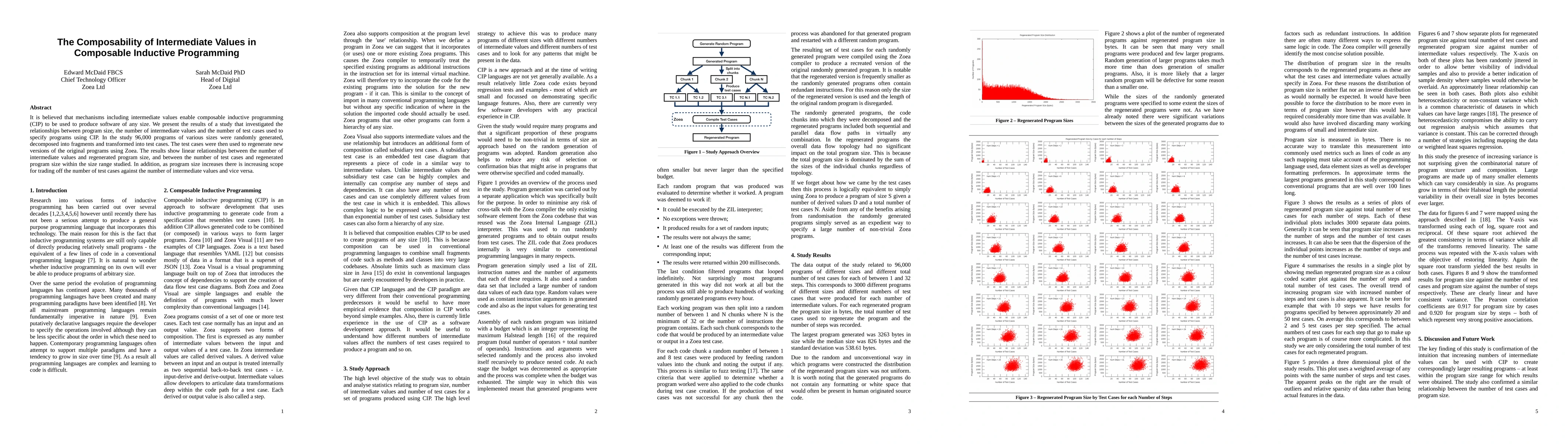 It is believed that mechanisms including intermediate values enable composable inductive programming (CIP) to be used to produce software of any size. We present the results of a study that investigated the relationships between program size, the number of intermediate values and the number of test cases used to specify programs using CIP. In the study 96,000 programs of various sizes were randomly generated, decomposed into fragments and transformed into test cases. The test cases were then used to regenerate new versions of the original programs using Zoea. The results show linear relationships between the number of intermediate values and regenerated program size, and between the number of test cases and regenerated program size within the size range studied. In addition, as program size increases there is increasing scope for trading off the number of test cases against the number of intermediate values and vice versa.