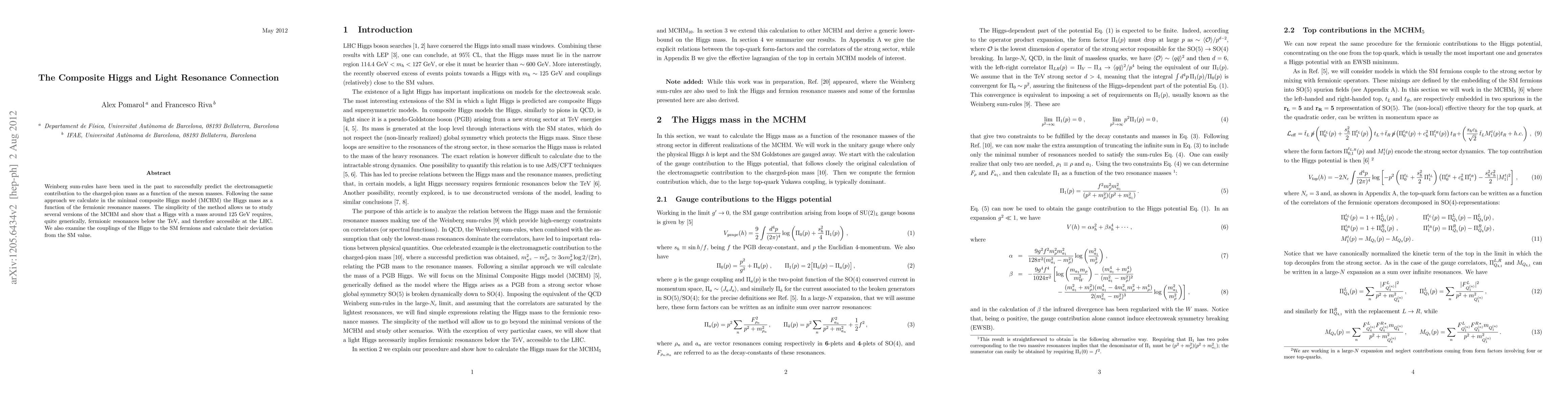 Weinberg sum-rules have been used in the past to successfully predict the electromagnetic contribution to the charged-pion mass as a function of the meson masses. Following the same approach we calculate in the minimal composite Higgs model (MCHM) the Higgs mass as a function of the fermionic resonance masses. The simplicity of the method allows us to study several versions of the MCHM and show that a Higgs with a mass around 125 GeV requires, quite generically, fermionic resonances below the TeV, and therefore accessible at the LHC. We also examine the couplings of the Higgs to the SM fermions and calculate their deviation from the SM value.