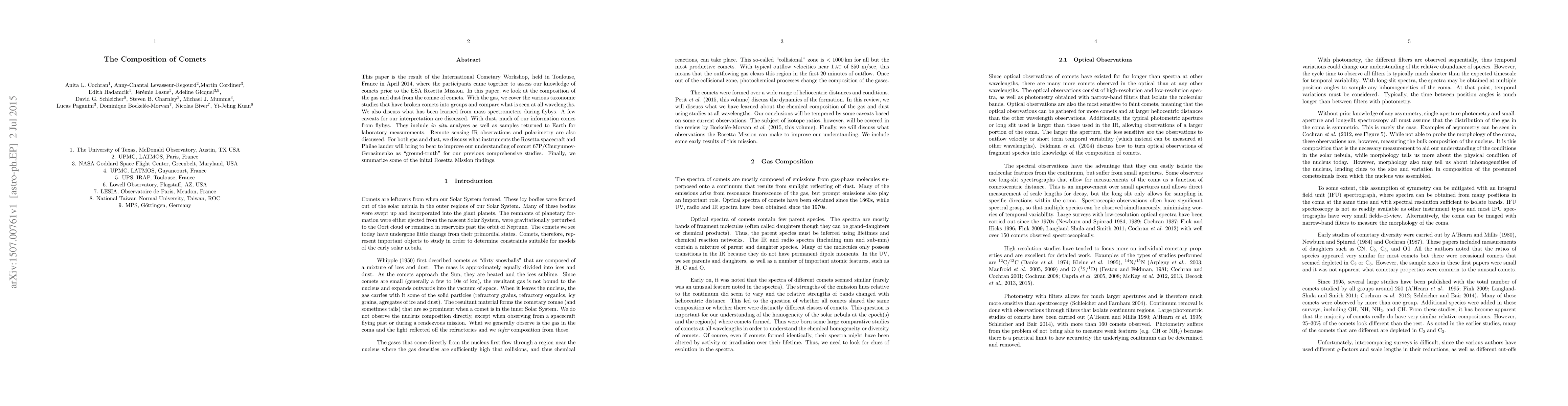 This paper summarizes the composition of comets, including gas and dust, based on previous studies and upcoming missions like ESA Rosetta. It discusses key findings from mass spectrometers, flybys, and laboratory measurements to improve understanding of comet 67P/Churyumov-Gerasimenko.