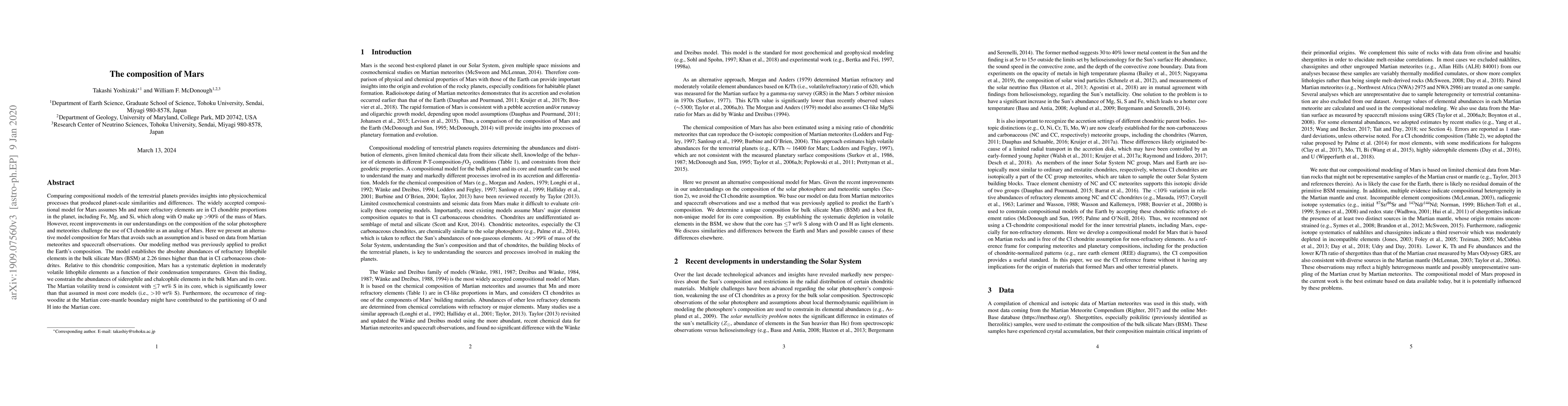 This paper proposes an alternative compositional model for Mars based on Martian meteorites and spacecraft data, suggesting refractory lithophile elements are 2.26 times more abundant than in CI chondrites. The model indicates a systematic depletion in moderately volatile elements and constrains siderophile and chalcophile elements, suggesting a lower sulfur content in the Martian core than previously assumed.