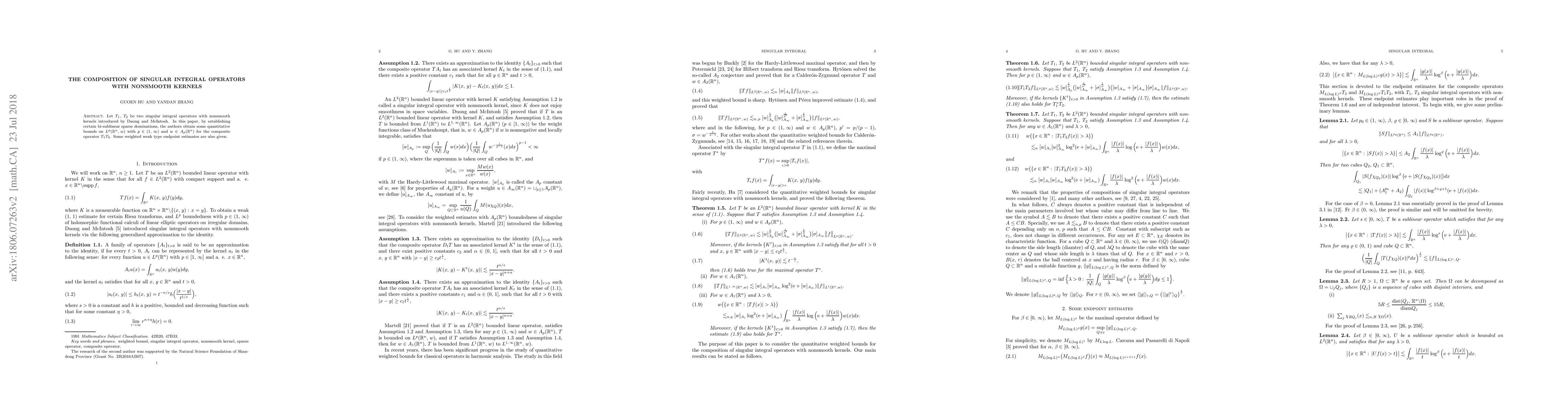 Let $T_1$, $T_2$ be two singular integral operators with nonsmooth kernels introduced by Duong and McIntosh. In this paper, by establishing certain bi-sublinear sparse domination, the authors obtain some quantitative bounds on $L^p(\mathbb{R}^n,\,w)$ with $p\in(1,\,\infty)$ and $w\in A_p(\mathbb{R}^n)$ for the composite operator $T_1T_2$. Some weighted weak type endpoint estimates are also given.