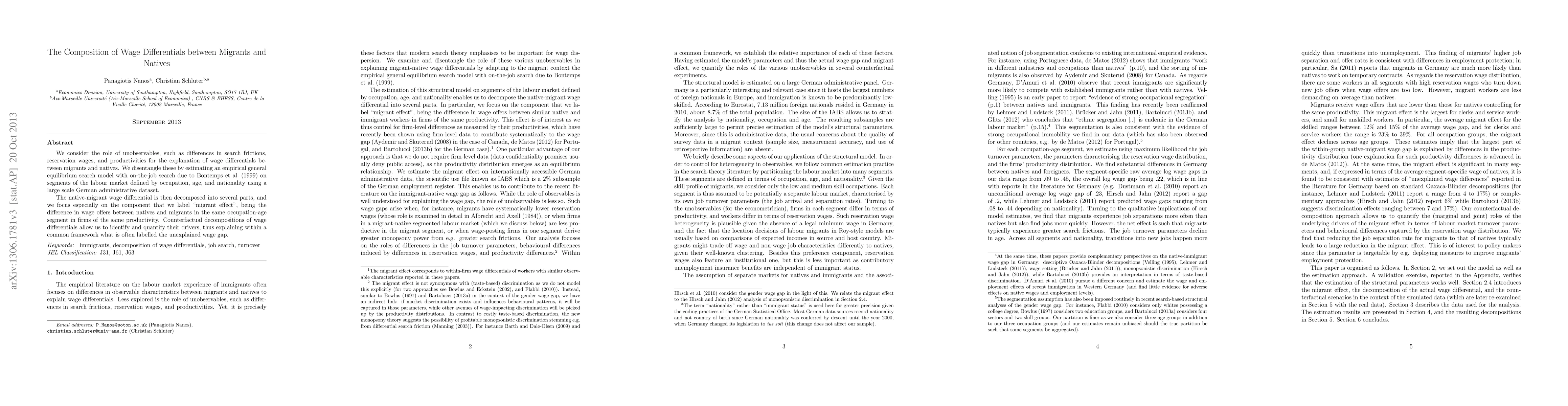 This paper investigates the wage differentials between migrants and natives by estimating an empirical general equilibrium search model, focusing on unobservable factors like search frictions and productivity differences. The study decomposes the wage gap into components, particularly highlighting the "migrant effect" to explain the unexplained wage gap within a unified framework.