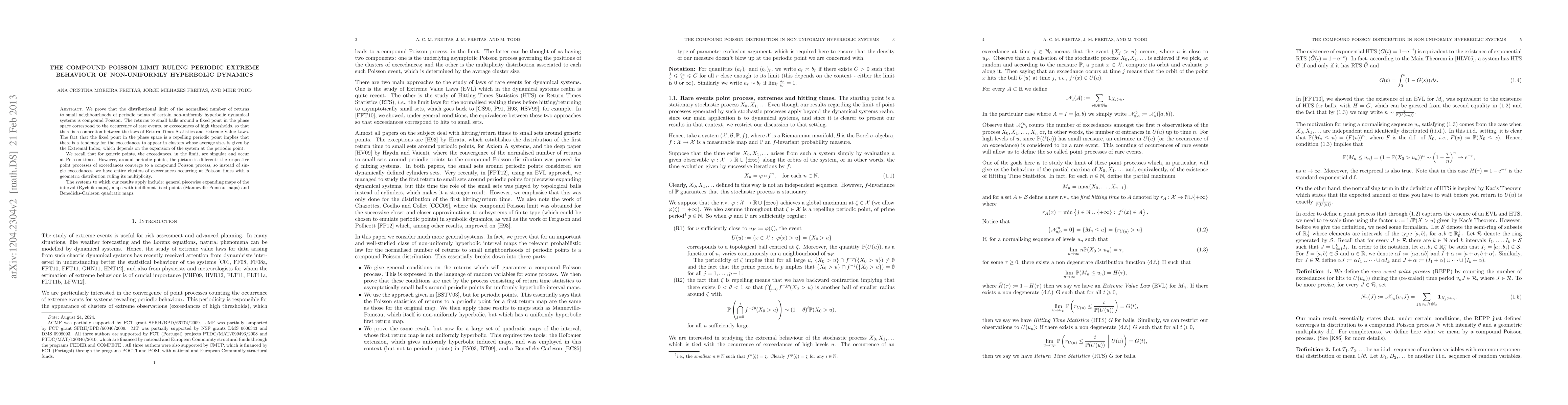 We prove that the distributional limit of the normalised number of returns to small neighbourhoods of periodic points of non-uniformly hyperbolic dynamical systems is compound Poisson. The returns to small balls around a fixed point in the phase space correspond to the occurrence of rare events, or exceedances of high thresholds, so that there is a connection between the laws of Return Times Statistics and Extreme Value Laws. The fact that the fixed point in the phase space is a repelling periodic point implies that there is a tendency for the exceedances to appear in clusters whose average sizes is given by the Extremal Index, which depends on the expansion of the system at the periodic point. We recall that for generic points, the exceedances, in the limit, are singular and occur at Poisson times. However, around periodic points, the picture is different: the respective point processes of exceedances converge to a compound Poisson process, so instead of single exceedances, we have entire clusters of exceedances occurring at Poisson times with a geometric distribution ruling its multiplicity. The systems to which our results apply include: general piecewise expanding maps of the interval (Rychlik maps), maps with indifferent fixed points (Manneville-Pomeau maps) and Benedicks-Carleson quadratic maps.