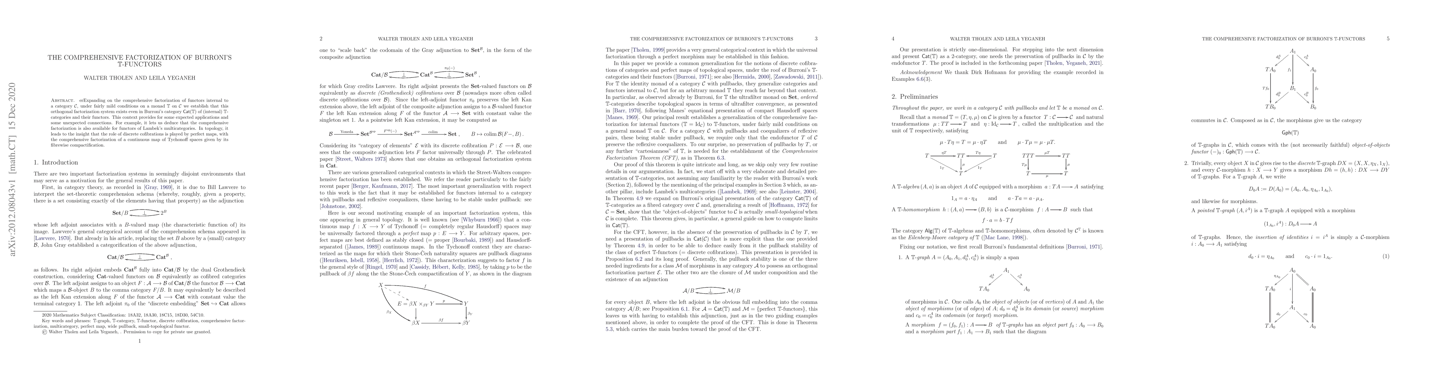 This paper establishes the comprehensive factorization of functors within Burroni's category of T-categories under mild conditions on a monad T, revealing applications and connections to Lambek's multicategories and topological insights regarding perfect maps.