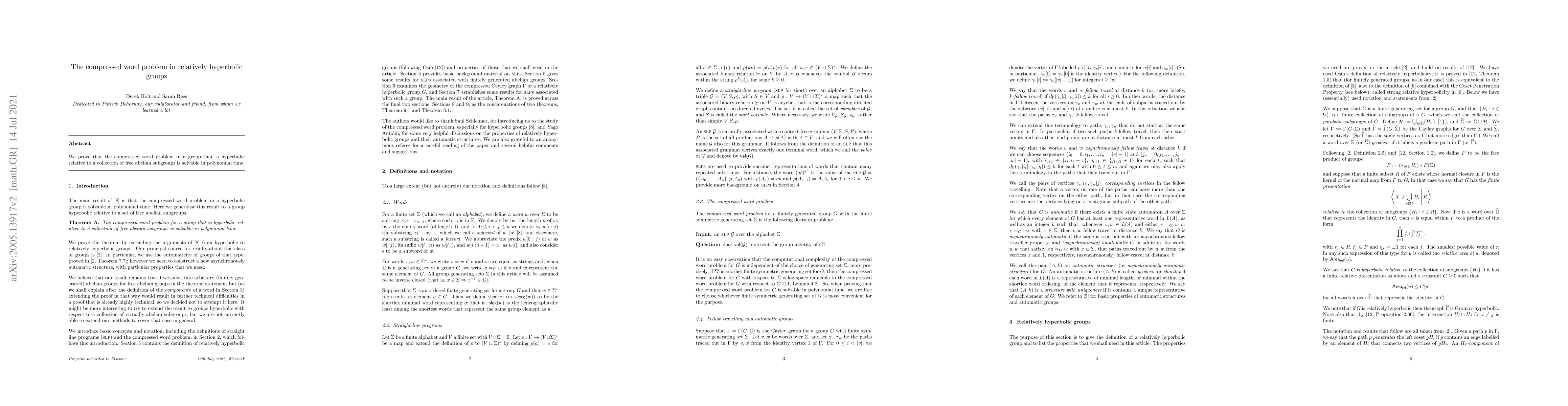 Summary: The paper demonstrates that the compressed word problem in relatively hyperbolic groups, which are hyperbolic relative to free abelian subgroups, can be solved in polynomial time. This provides an efficient algorithmic solution to a significant problem in group theory.