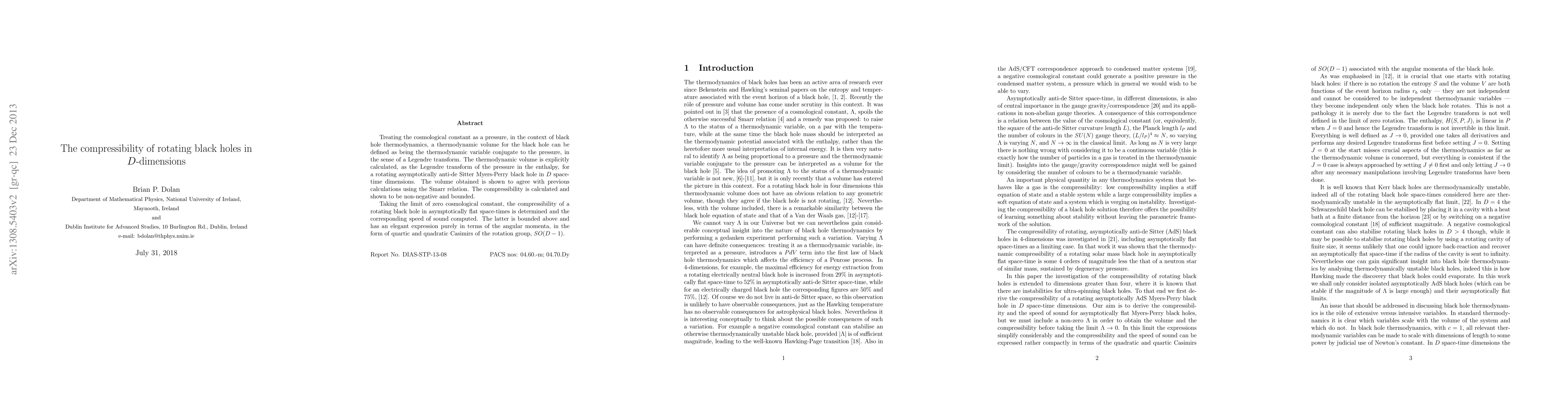 Treating the cosmological constant as a pressure, in the context of black hole thermodynamics, a thermodynamic volume for the black hole can be defined as being the thermodynamic variable conjugate to the pressure, in the sense of a Legendre transform. The thermodynamic volume is explicitly calculated, as the Legendre transform of the pressure in the enthalpy for a rotating asymptotically anti-de Sitter Myers-Perry black hole in D space-time dimensions. The volume obtained is shown to agree with previous calculations using the Smarr relation. The compressibility is calculated and shown to be non-negative and bounded. Taking the limit of zero cosmological constant, the compressibility of a rotating black hole in asymptotically flat space-times is determined and the corresponding speed of sound computed. The latter is bounded above and has an elegant expression purely in terms of the angular momenta, in the form of quartic and quadratic Casimirs of the rotation group, SO(D-1).