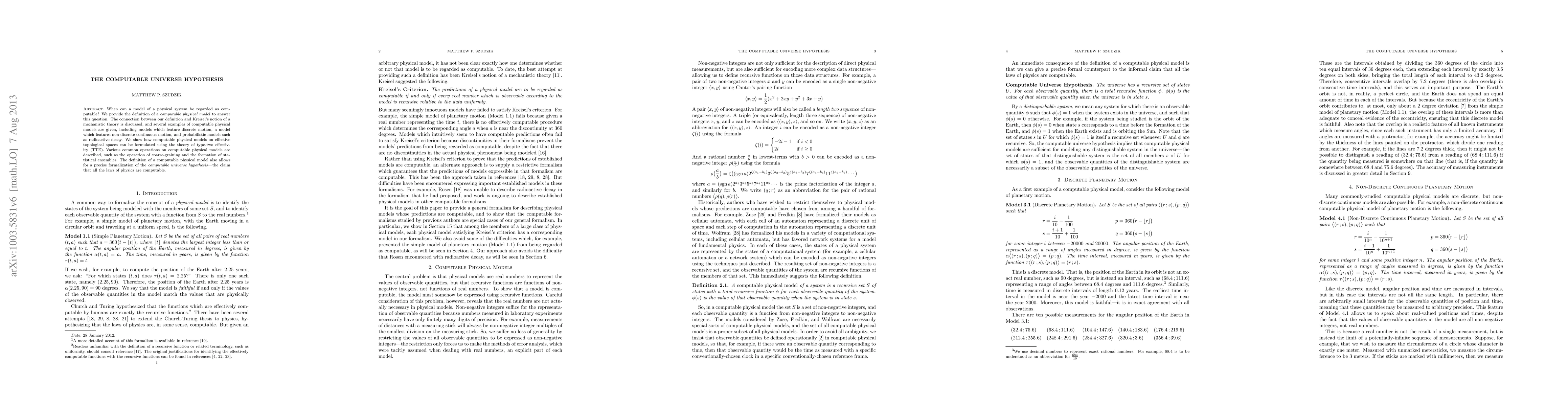 This paper defines a computable physical model to determine when a model of a physical system can be regarded as computable. It connects this definition to Kreisel's mechanistic theory and illustrates with examples, including discrete and continuous motion models, and probabilistic models. The paper also discusses the application of type-two effectivity and operations like coarse-graining to formulate computable physical models, ultimately formalizing the computable universe hypothesis.