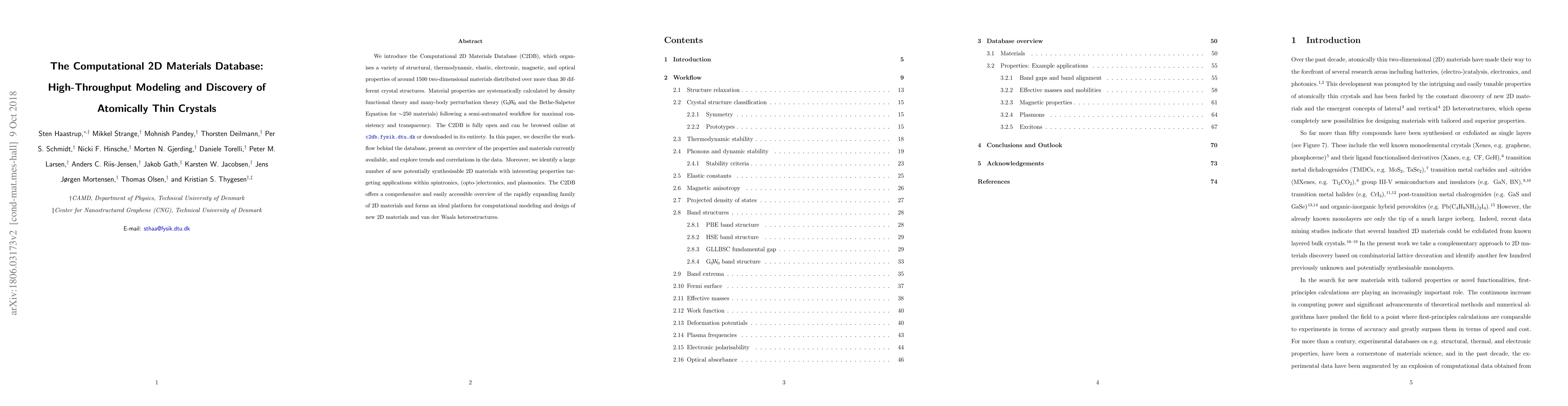 The Computational 2D Materials Database (C2DB) organizes properties of around 1500 2D materials using high-throughput calculations, identifying new materials with potential applications in spintronics and electronics. The database is open for online browsing and download.