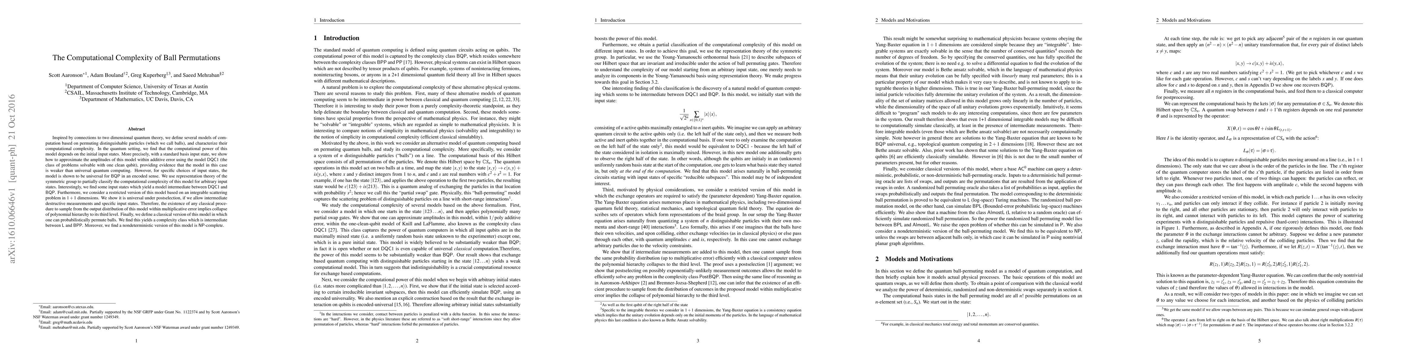 Inspired by connections to two dimensional quantum theory, we define several models of computation based on permuting distinguishable particles (which we call balls), and characterize their computational complexity. In the quantum setting, we find that the computational power of this model depends on the initial input states. More precisely, with a standard basis input state, we show how to approximate the amplitudes of this model within additive error using the model DQC1 (the class of problems solvable with one clean qubit), providing evidence that the model in this case is weaker than universal quantum computing. However, for specific choices of input states, the model is shown to be universal for BQP in an encoded sense. We use representation theory of the symmetric group to partially classify the computational complexity of this model for arbitrary input states. Interestingly, we find some input states which yield a model intermediate between DQC1 and BQP. Furthermore, we consider a restricted version of this model based on an integrable scattering problem in 1+1 dimensions. We show it is universal under postselection, if we allow intermediate destructive measurements and specific input states. Therefore, the existence of any classical procedure to sample from the output distribution of this model within multiplicative error implies collapse of polynomial hierarchy to its third level. Finally, we define a classical version of this model in which one can probabilistically permute balls. We find this yields a complexity class which is intermediate between L and BPP. Moreover, we find a nondeterministic version of this model is NP-complete.