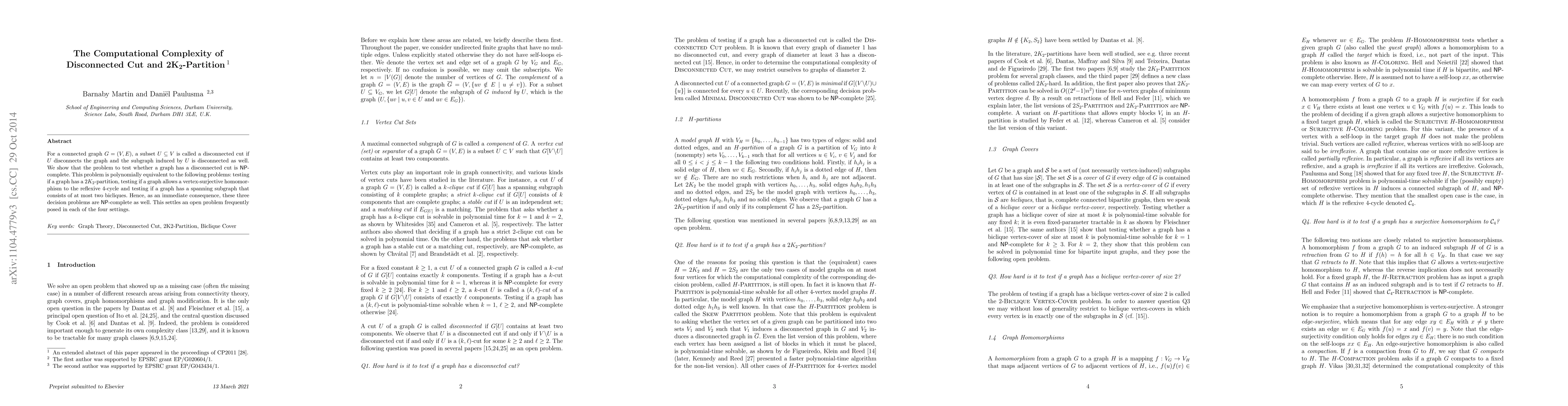 For a connected graph G=(V,E), a subset U of V is called a disconnected cut if U disconnects the graph and the subgraph induced by U is disconnected as well. We show that the problem to test whether a graph has a disconnected cut is NP-complete. This problem is polynomially equivalent to the following problems: testing if a graph has a 2K2-partition, testing if a graph allows a vertex-surjective homomorphism to the reflexive 4-cycle and testing if a graph has a spanning subgraph that consists of at most two bicliques. Hence, as an immediate consequence, these three decision problems are NP-complete as well. This settles an open problem frequently posed in each of the four settings.