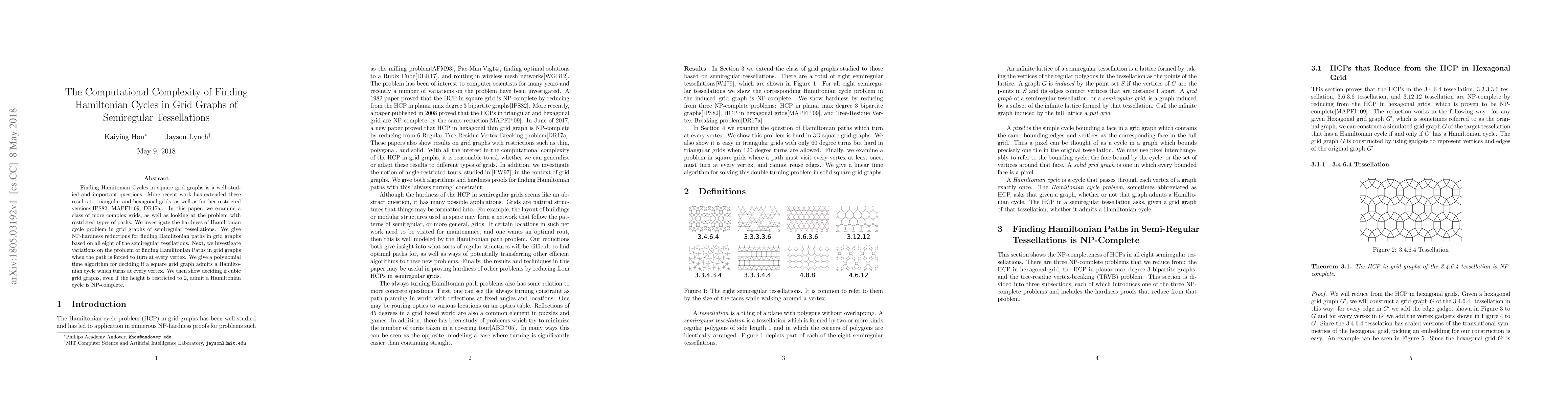 This paper explores the computational complexity of finding Hamiltonian cycles in grid graphs derived from semiregular tessellations, proving NP-hardness for general cases and providing a polynomial time algorithm for square grid graphs with restricted turns. It also demonstrates the NP-completeness of the problem for cubic grid graphs with height restriction.