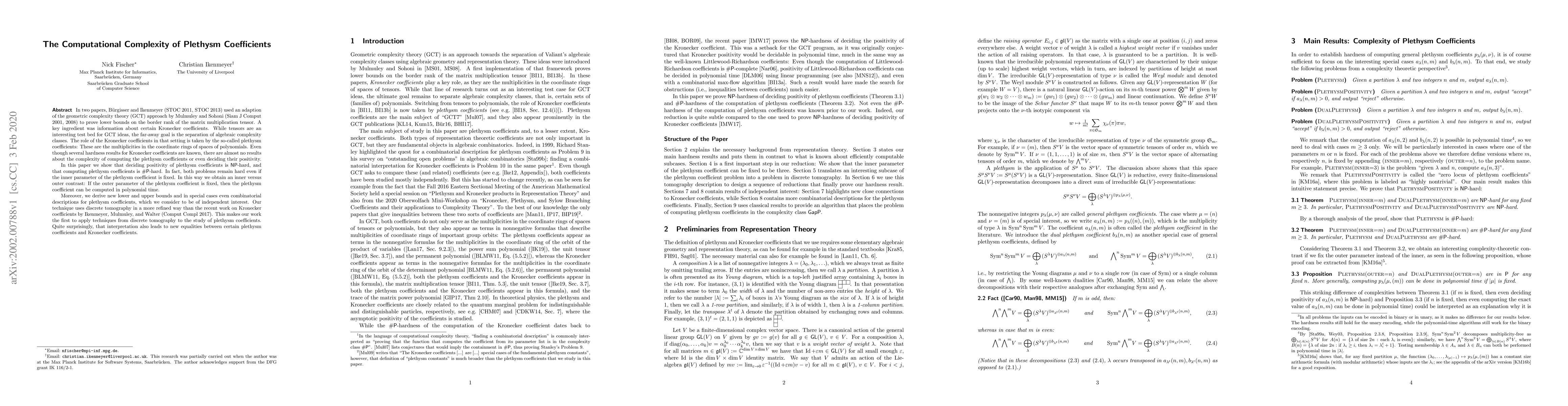 This paper demonstrates that deciding the positivity and computing plethysm coefficients are NP-hard and #P-hard, respectively. It contrasts the complexity when the inner parameter is fixed versus when the outer parameter is fixed, revealing an inner versus outer computational complexity distinction.