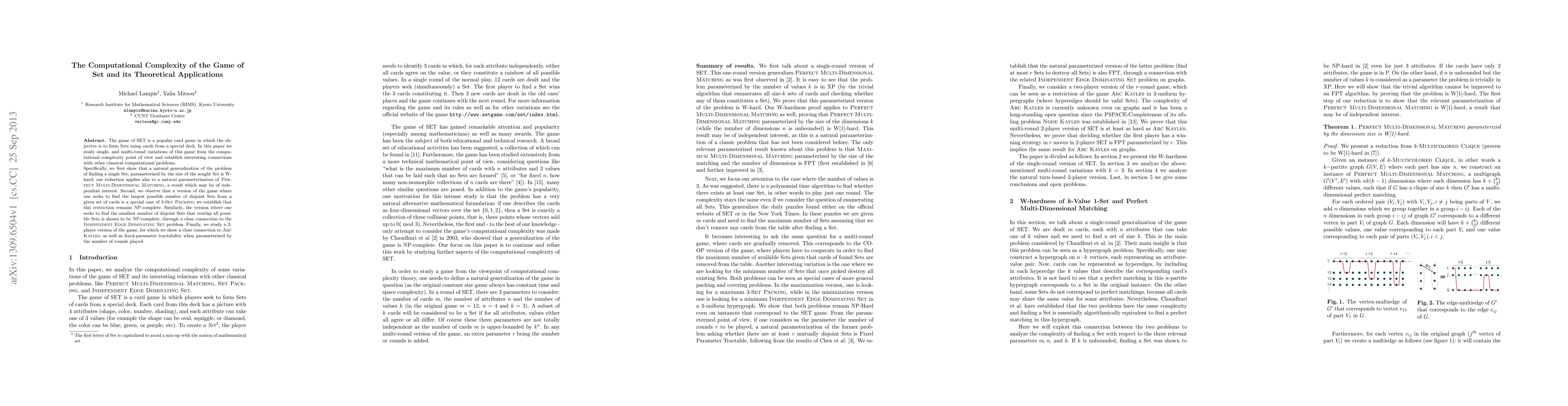 The game of SET is a popular card game in which the objective is to form Sets using cards from a special deck. In this paper we study single- and multi-round variations of this game from the computational complexity point of view and establish interesting connections with other classical computational problems. Specifically, we first show that a natural generalization of the problem of finding a single Set, parameterized by the size of the sought Set is W-hard; our reduction applies also to a natural parameterization of Perfect Multi-Dimensional Matching, a result which may be of independent interest. Second, we observe that a version of the game where one seeks to find the largest possible number of disjoint Sets from a given set of cards is a special case of 3-Set Packing; we establish that this restriction remains NP-complete. Similarly, the version where one seeks to find the smallest number of disjoint Sets that overlap all possible Sets is shown to be NP-complete, through a close connection to the Independent Edge Dominating Set problem. Finally, we study a 2-player version of the game, for which we show a close connection to Arc Kayles, as well as fixed-parameter tractability when parameterized by the number of rounds played.