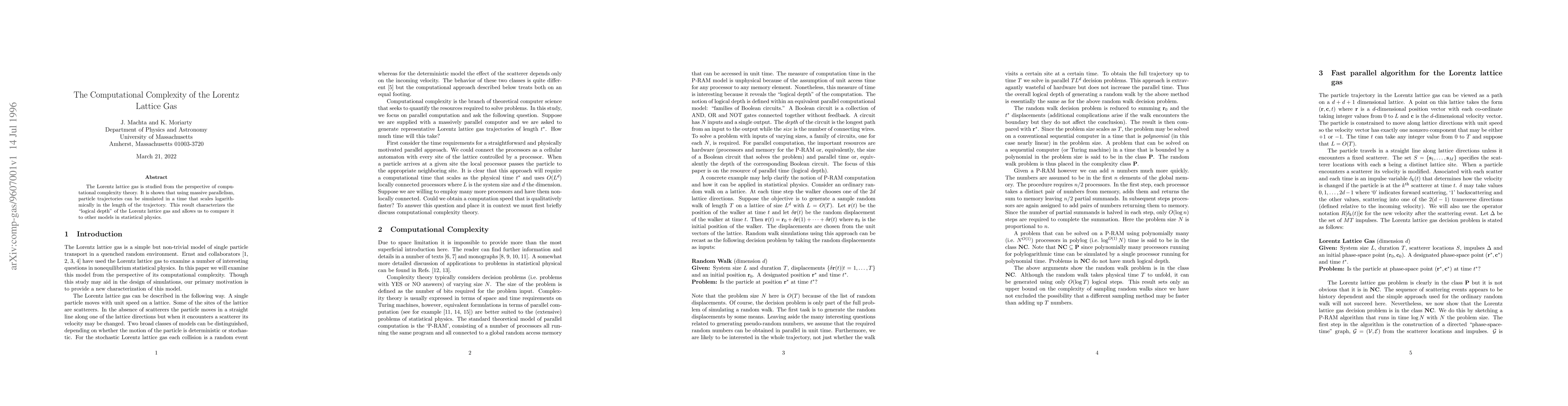 The Lorentz lattice gas is studied from the perspective of computational complexity theory. It is shown that using massive parallelism, particle trajectories can be simulated in a time that scales logarithmically in the length of the trajectory. This result characterizes the ``logical depth" of the Lorentz lattice gas and allows us to compare it to other models in statistical physics.