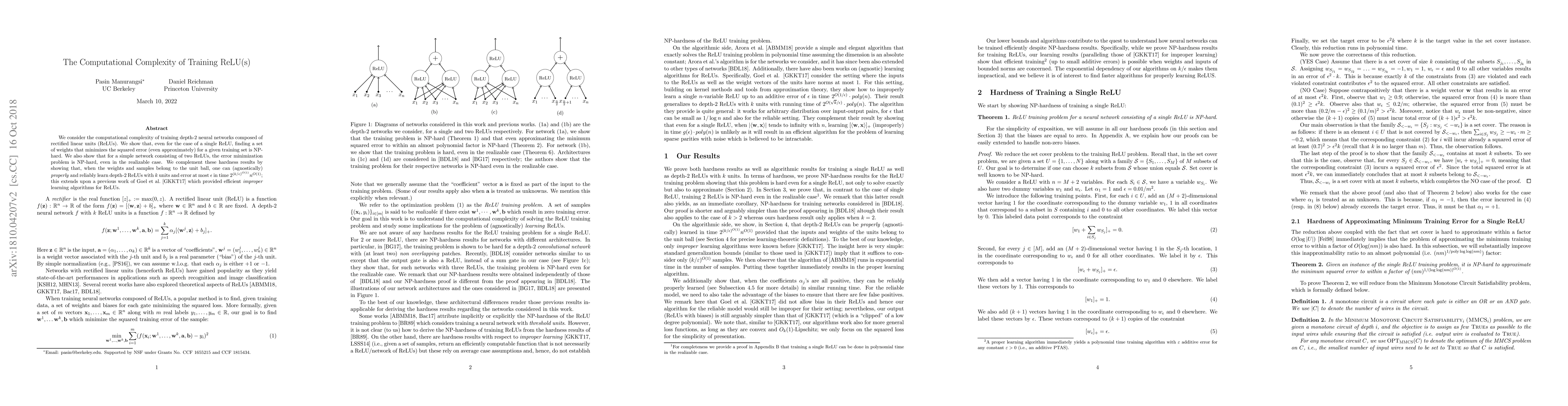 We consider the computational complexity of training depth-2 neural networks composed of rectified linear units (ReLUs). We show that, even for the case of a single ReLU, finding a set of weights that minimizes the squared error (even approximately) for a given training set is NP-hard. We also show that for a simple network consisting of two ReLUs, the error minimization problem is NP-hard, even in the realizable case. We complement these hardness results by showing that, when the weights and samples belong to the unit ball, one can (agnostically) properly and reliably learn depth-2 ReLUs with $k$ units and error at most $\epsilon$ in time $2^{(k/\epsilon)^{O(1)}}n^{O(1)}$; this extends upon a previous work of Goel, Kanade, Klivans and Thaler (2017) which provided efficient improper learning algorithms for ReLUs.