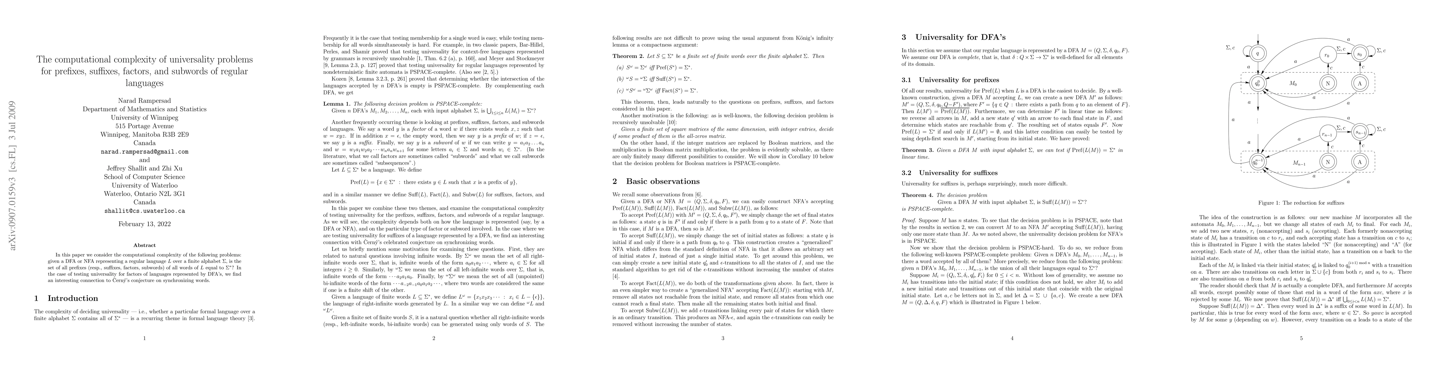 This paper investigates the computational complexity of determining whether the set of all prefixes, suffixes, factors, or subwords of words in a given regular language (represented by a DFA or NFA) equals the entire alphabet's Kleene star. It also explores a connection between universality for factors of DFA-represented languages and Cerny's conjecture on synchronizing words.