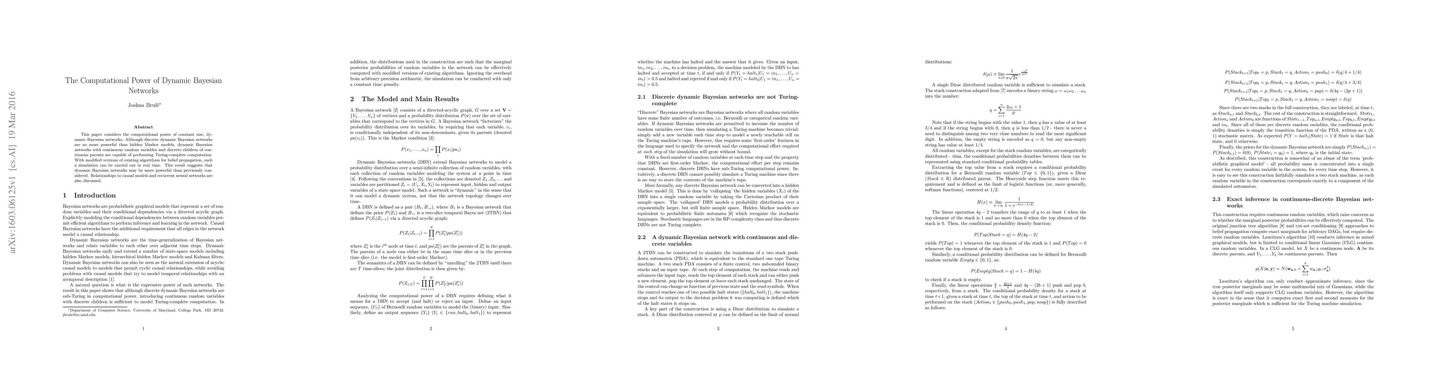 This paper demonstrates that dynamic Bayesian networks with continuous variables and discrete children of continuous parents can perform Turing-complete computations, suggesting greater computational power than previously thought. The study also explores connections to causal models and recurrent neural networks.