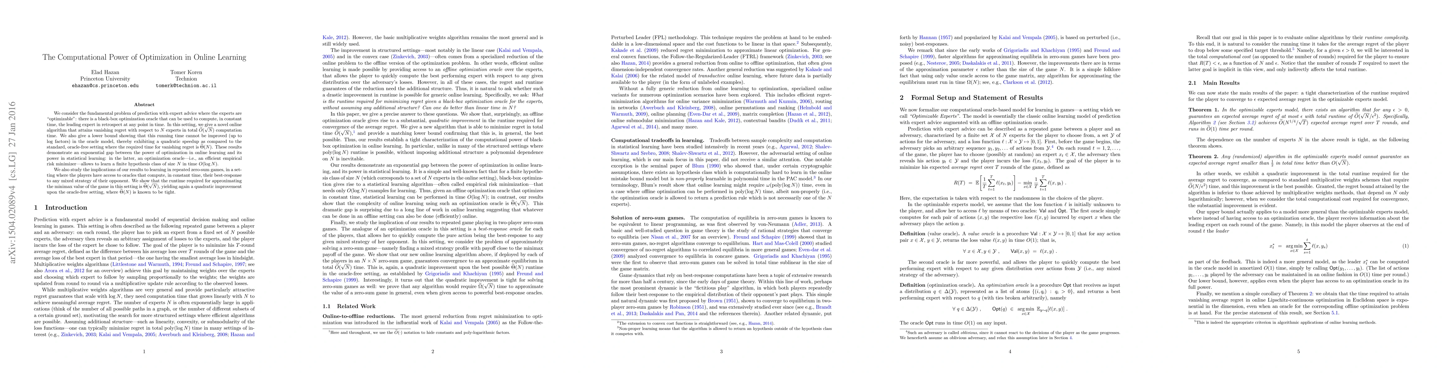 We consider the fundamental problem of prediction with expert advice where the experts are "optimizable": there is a black-box optimization oracle that can be used to compute, in constant time, the leading expert in retrospect at any point in time. In this setting, we give a novel online algorithm that attains vanishing regret with respect to $N$ experts in total $\widetilde{O}(\sqrt{N})$ computation time. We also give a lower bound showing that this running time cannot be improved (up to log factors) in the oracle model, thereby exhibiting a quadratic speedup as compared to the standard, oracle-free setting where the required time for vanishing regret is $\widetilde{\Theta}(N)$. These results demonstrate an exponential gap between the power of optimization in online learning and its power in statistical learning: in the latter, an optimization oracle---i.e., an efficient empirical risk minimizer---allows to learn a finite hypothesis class of size $N$ in time $O(\log{N})$. We also study the implications of our results to learning in repeated zero-sum games, in a setting where the players have access to oracles that compute, in constant time, their best-response to any mixed strategy of their opponent. We show that the runtime required for approximating the minimax value of the game in this setting is $\widetilde{\Theta}(\sqrt{N})$, yielding again a quadratic improvement upon the oracle-free setting, where $\widetilde{\Theta}(N)$ is known to be tight.