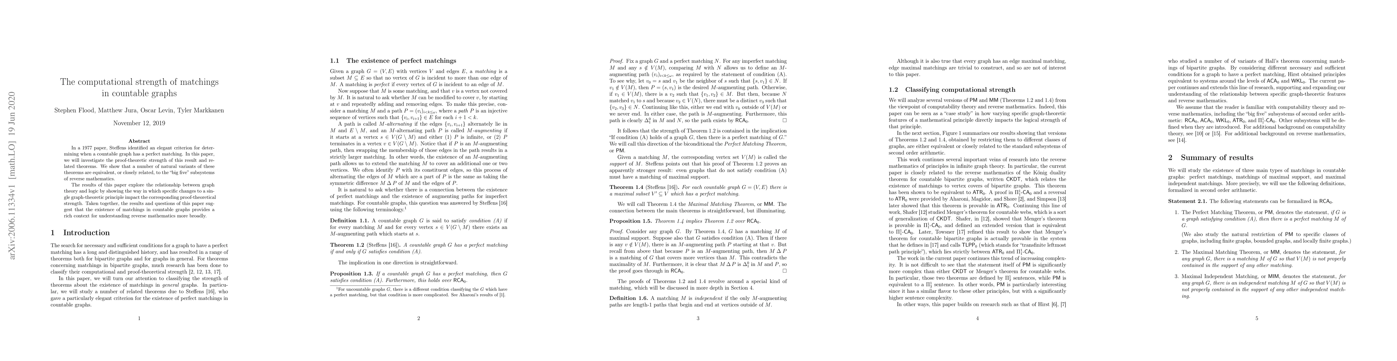 In a 1977 paper, Steffens identified an elegant criterion for determining when a countable graph has a perfect matching. In this paper, we will investigate the proof-theoretic strength of this result and related theorems. We show that a number of natural variants of these theorems are equivalent, or closely related, to the ``big five'' subsystems of reverse mathematics. The results of this paper explore the relationship between graph theory and logic by showing the way in which specific changes to a single graph-theoretic principle impact the corresponding proof-theoretical strength. Taken together, the results and questions of this paper suggest that the existence of matchings in countable graphs provides a rich context for understanding reverse mathematics more broadly.