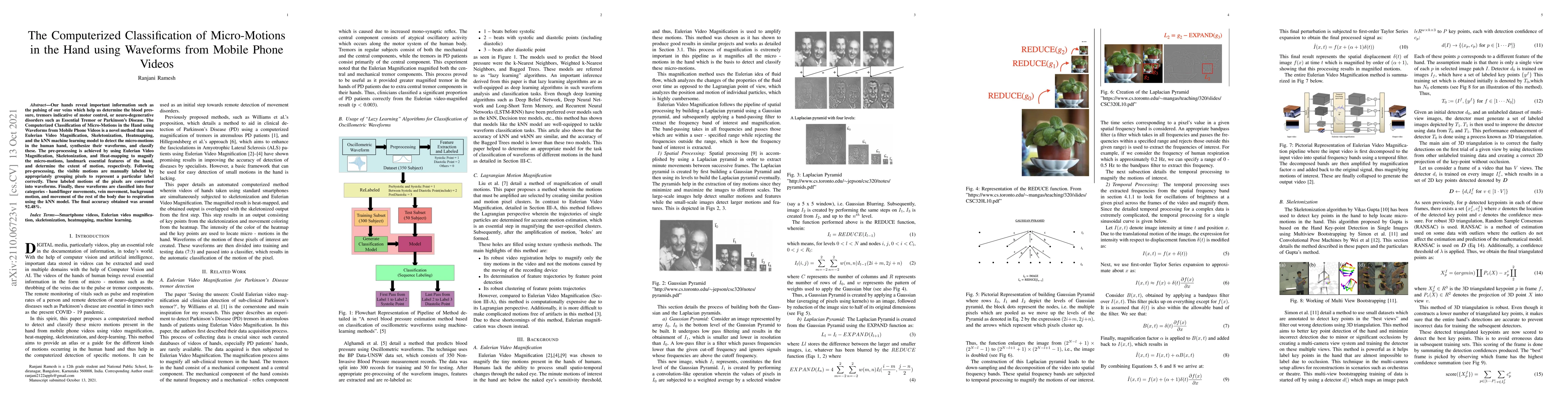 Our hands reveal important information such as the pulsing of our veins which help us determine the blood pressure, tremors indicative of motor control, or neurodegenerative disorders such as Essential Tremor or Parkinson's disease. The Computerized Classification of Micro-Motions in the hand using waveforms from mobile phone videos is a novel method that uses Eulerian Video Magnification, Skeletonization, Heatmapping, and the kNN machine learning model to detect the micro-motions in the human hand, synthesize their waveforms, and classify these. The pre-processing is achieved by using Eulerian Video Magnification, Skeletonization, and Heat-mapping to magnify the micro-motions, landmark essential features of the hand, and determine the extent of motion, respectively. Following pre-processing, the visible motions are manually labeled by appropriately grouping pixels to represent a particular label correctly. These labeled motions of the pixels are converted into waveforms. Finally, these waveforms are classified into four categories - hand or finger movements, vein movement, background motion, and movement of the rest of the body due to respiration using the kNN model. The final accuracy obtained was around 92 percent.