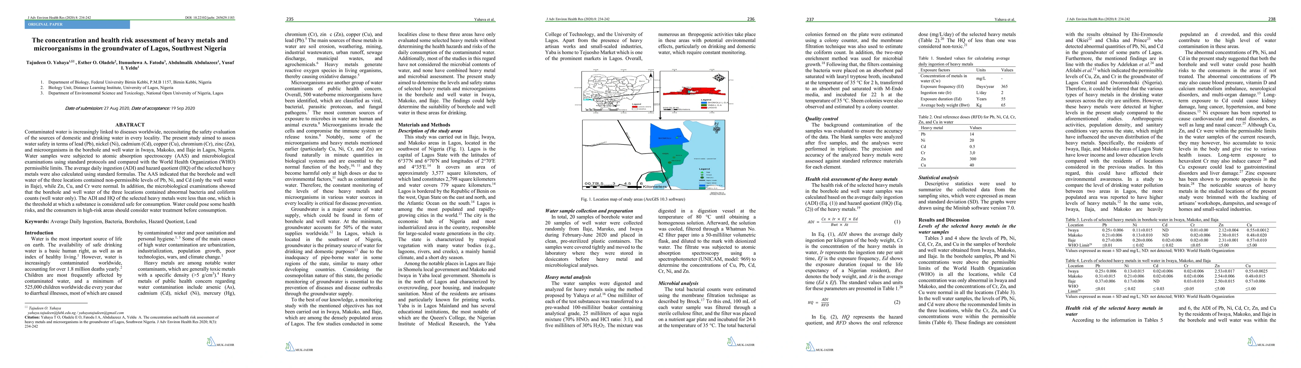 This study assesses the safety of groundwater in Lagos, Nigeria, by analyzing heavy metals and microorganisms in borehole and well water. Results show non-permissible levels of lead, nickel, and cadmium, and abnormal bacterial counts, indicating potential health risks that necessitate water treatment before consumption.