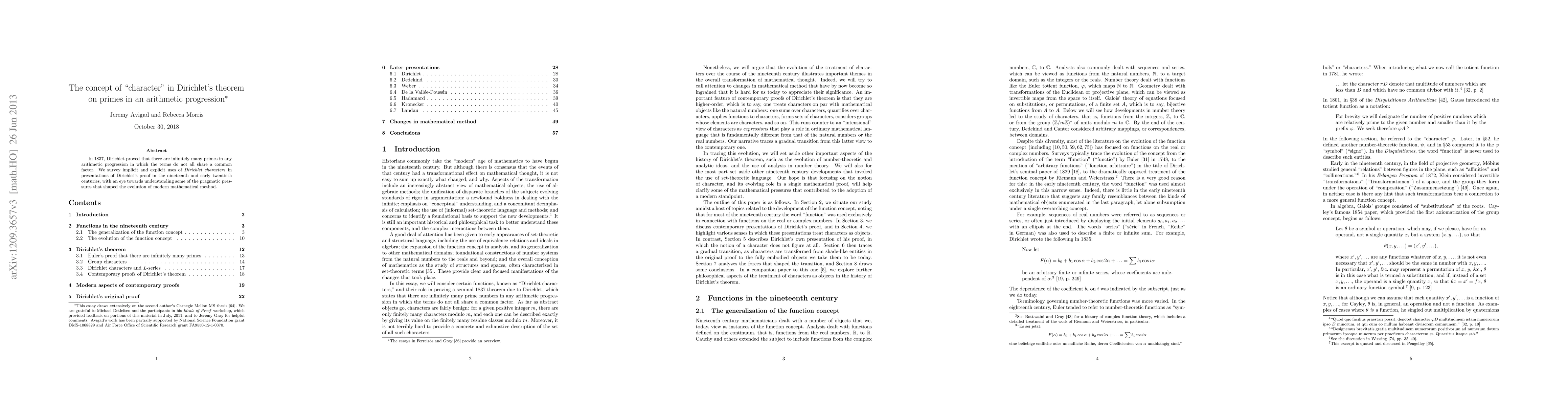 This paper explores how Dirichlet's theorem on primes in arithmetic progression was developed over time, highlighting the role of 'character' concepts in its proof. It reveals how mathematical method evolved under pragmatic pressures in the 19th and early 20th centuries.