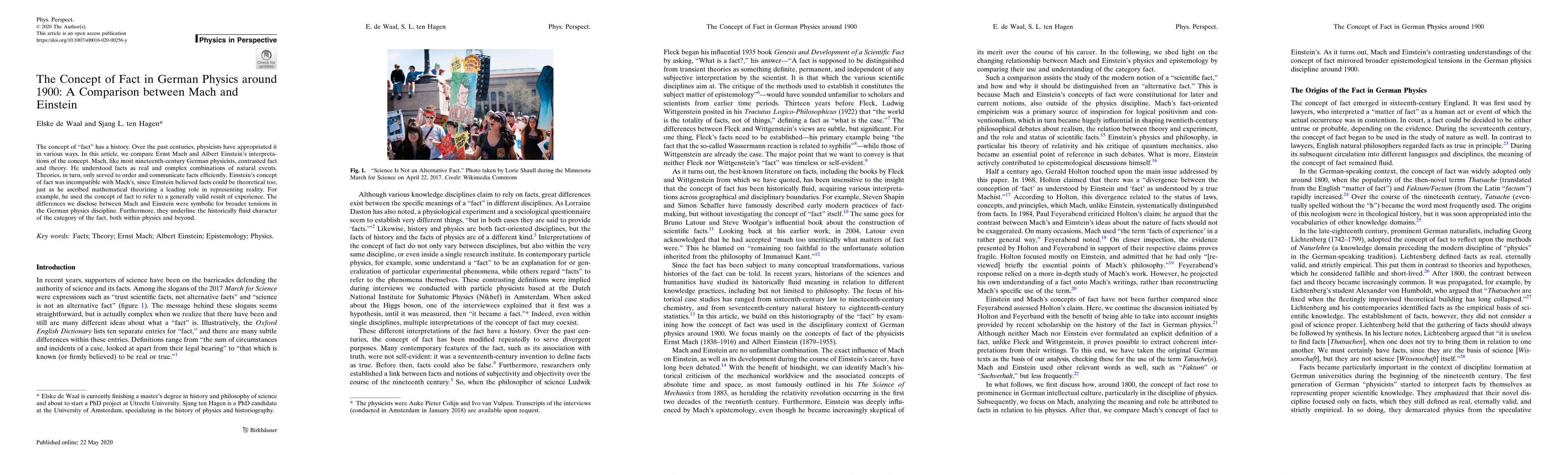 This paper compares Ernst Mach's and Albert Einstein's differing interpretations of the concept of fact in German physics around 1900. While Mach viewed facts as real, complex combinations of natural events, Einstein believed facts could be theoretical and emphasized the role of mathematical theorizing in representing reality.