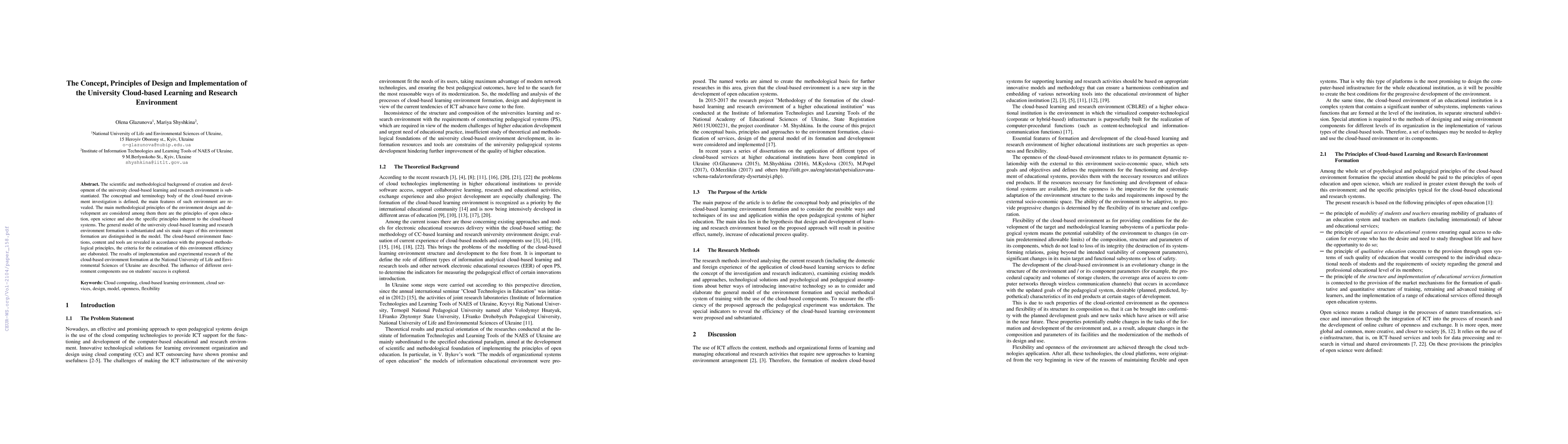 The scientific and methodological background of creation and development of the university cloud-based learning and research environment is substantiated. The conceptual and terminology body of the cloud-based environment investigation is defined, the main features of such environment are revealed. The main methodological principles of the environment design and development are considered among them there are the principles of open education, open science and also the specific principles inherent to the cloud-based systems. The general model of the university cloud-based learning and research environment formation is substantiated and six main stages of this environment formation are distinguished in the model. The cloud-based environment functions, content and tools are revealed in accordance with the proposed methodological principles, the criteria for the estimation of this environment efficiency are elaborated. The results of implementation and experimental research of the cloud-based environment formation at the National University of Life and Environmental Sciences of Ukraine are described. The influence of different environment components use on students' success is explored.