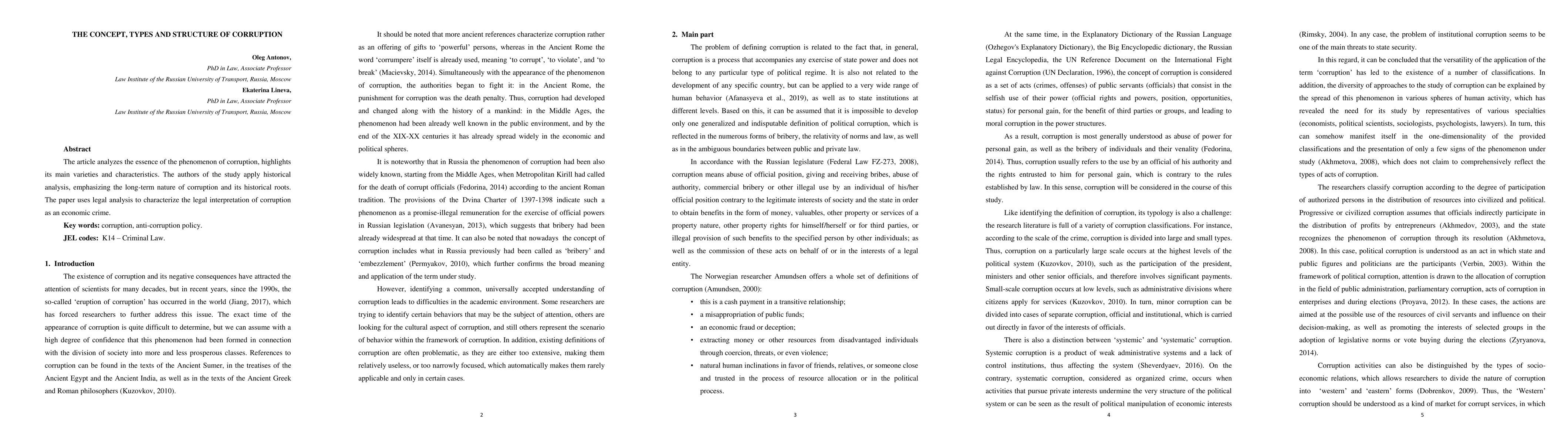 The article analyzes the essence of the phenomenon of corruption, highlights its main varieties and characteristics. The authors of the study apply historical analysis, emphasizing the long-term nature of corruption and its historical roots. The paper uses legal analysis to characterize the legal interpretation of corruption as an economic crime.