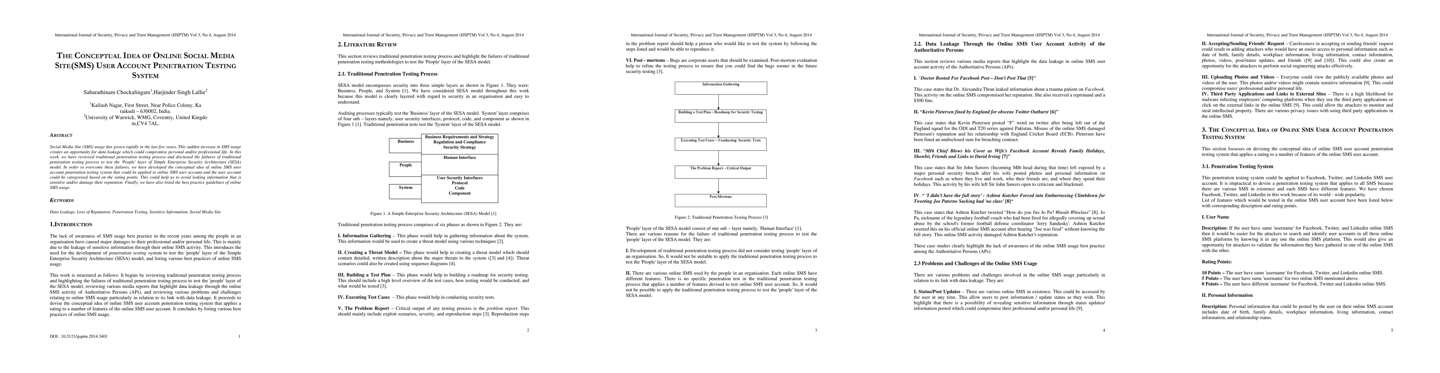 Social Media Site (SMS) usage has grown rapidly in the last few years. This sudden increase in SMS usage creates an opportunity for data leakage which could compromise personal and/or professional life. In this work, we have reviewed traditional penetration testing process and discussed the failures of traditional penetration testing process to test the 'People' layer of Simple Enterprise Security Architecture (SESA) model. In order to overcome these failures, we have developed the conceptual idea of online SMS user account penetration testing system that could be applied to online SMS user account and the user account could be categorised based on the rating points. This could help us to avoid leaking information that is sensitive and/or damage their reputation. Finally, we have also listed the best practice guidelines of online SMS usage.