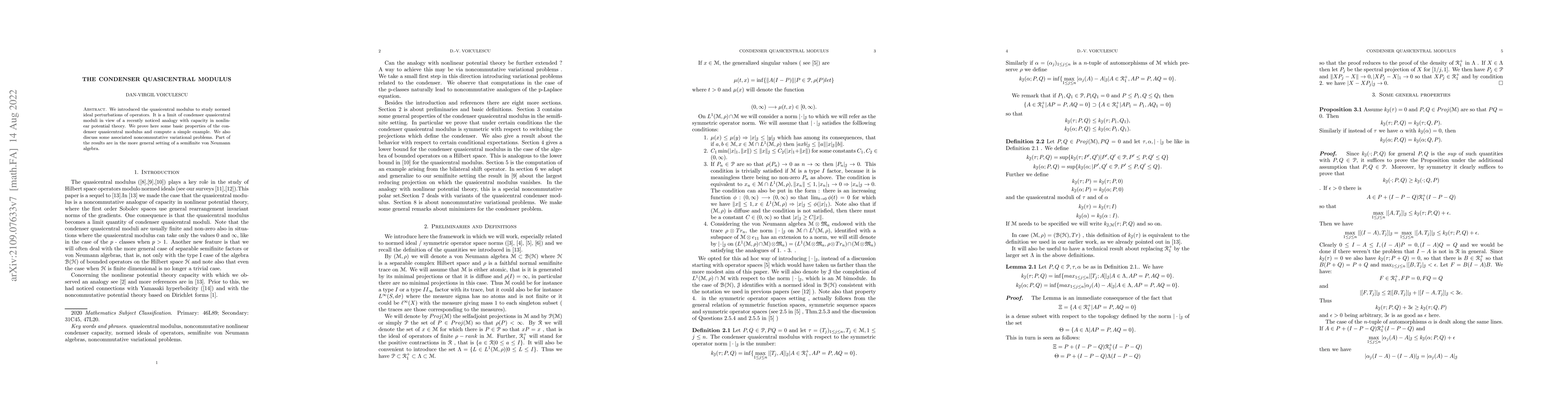 The paper introduces the quasicentral modulus for studying perturbations of operators, proving its properties and providing an example, and discussing associated variational problems within the context of semifinite von Neumann algebras. The concept mirrors capacity in nonlinear potential theory.