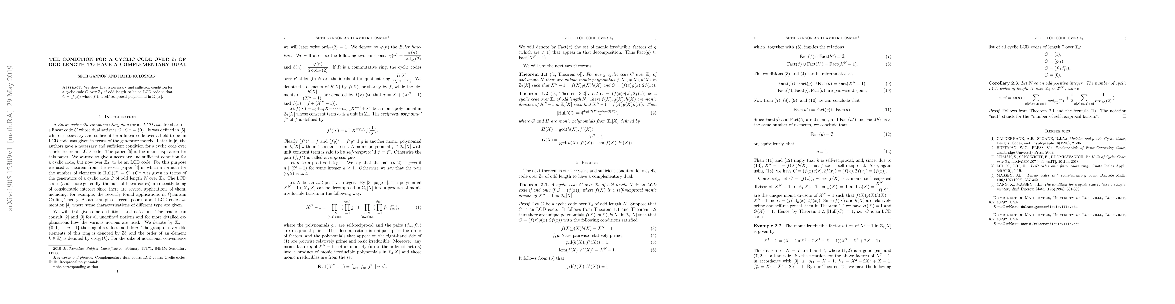 Summary: A cyclic code over Z4 of odd length is an LCD code if and only if it is generated by a self-reciprocal polynomial in Z4[X]. This establishes a necessary and sufficient condition for the existence of a complementary dual for such codes.
