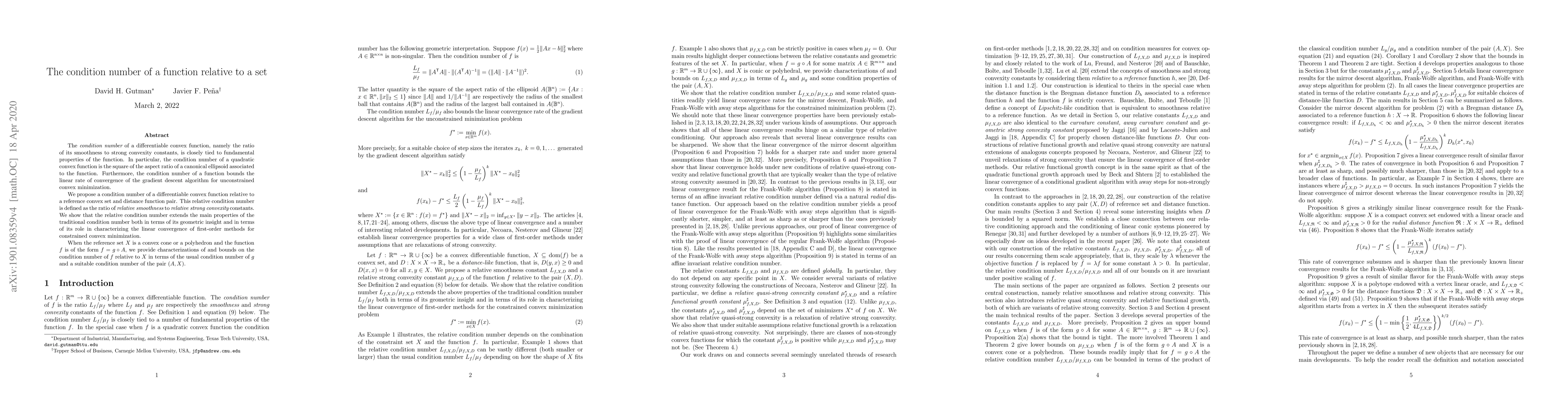 This paper introduces a new way to measure the condition number of convex functions relative to specific sets, extending traditional concepts to better understand constrained optimization. It links this relative condition number to the convergence rates of optimization algorithms, especially for functions constrained to cones or polyhedra.