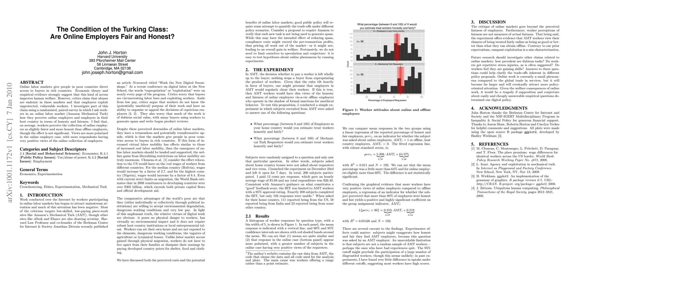 Online labor markets give people in poor countries direct access to buyers in rich countries. Economic theory and empirical evidence strongly suggest that this kind of access improves human welfare. However, critics claim that abuses are endemic in these markets and that employers exploit unprotected, vulnerable workers. I investigate part of this claim using a randomized, paired survey in which I ask workers in an online labor market (Amazon Mechanical Turk) how they perceive online employers and employers in their host country in terms of honesty and fairness. I find that, on average, workers perceive the collection of online employers as slightly fairer and more honest than offline employers, though the effect is not significant. Views are more polarized in the online employer case, with more respondents having very positive views of the online collection of employers.