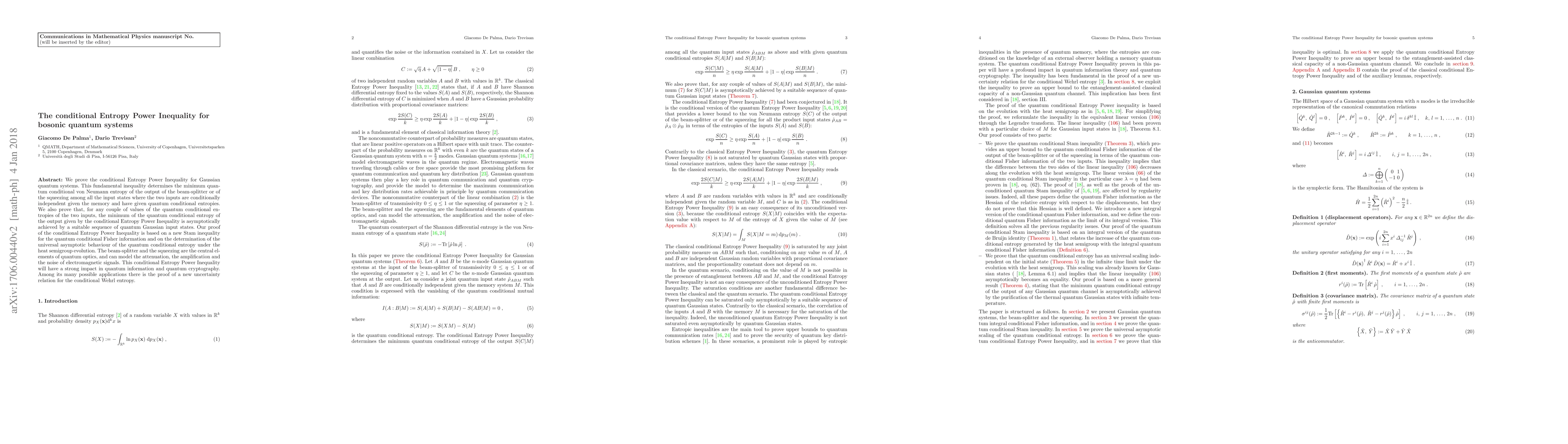 This paper proves the conditional Entropy Power Inequality for Gaussian quantum systems, establishing the minimum quantum conditional von Neumann entropy for beam-splitter and squeezing operations. The proof leverages a new Stam inequality and the quantum conditional Fisher information, with implications for quantum information and cryptography.