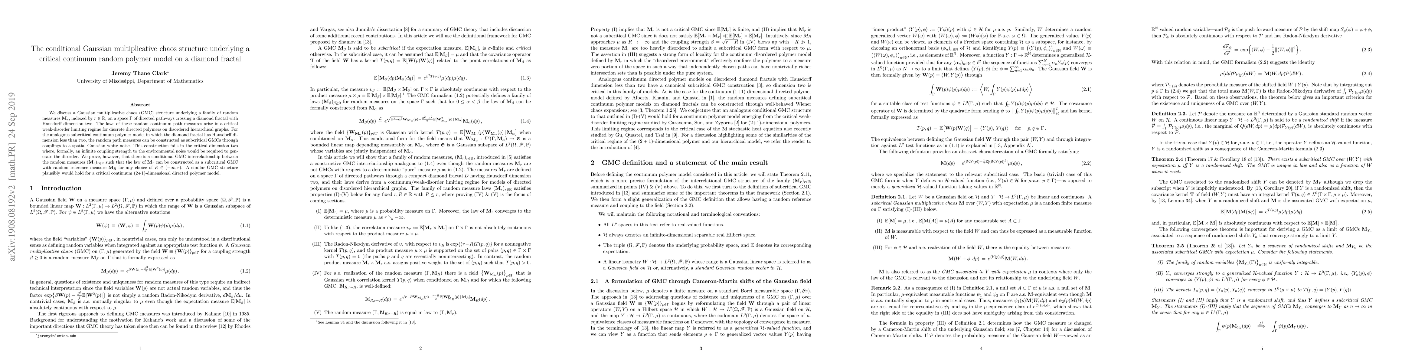 We discuss a Gaussian multiplicative chaos (GMC) structure underlying a family of random measures $\mathbf{M}_r$, indexed by $r\in\mathbb{R}$, on a space $\Gamma$ of directed pathways crossing a diamond fractal with Hausdorff dimension two. The laws of these random continuum path measures arise in a critical weak-disorder limiting regime for discrete directed polymers on disordered hierarchical graphs. For the analogous subcritical continuum polymer model in which the diamond fractal has Hausdorff dimension less than two, the random path measures can be constructed as subcritical GMCs through couplings to a spatial Gaussian white noise. This construction fails in the critical dimension two where, formally, an infinite coupling strength to the environmental noise would be required to generate the disorder. We prove, however, that there is a conditional GMC interrelationship between the random measures $(\mathbf{M}_r)_{r\in \mathbb{R}}$ such that the law of $\mathbf{M}_r$ can be constructed as a subcritical GMC with random reference measure $\mathbf{M}_R$ for any choice of $R\in (-\infty, r)$. A similar GMC structure plausibly would hold for a critical continuum (2+1)-dimensional directed polymer model.