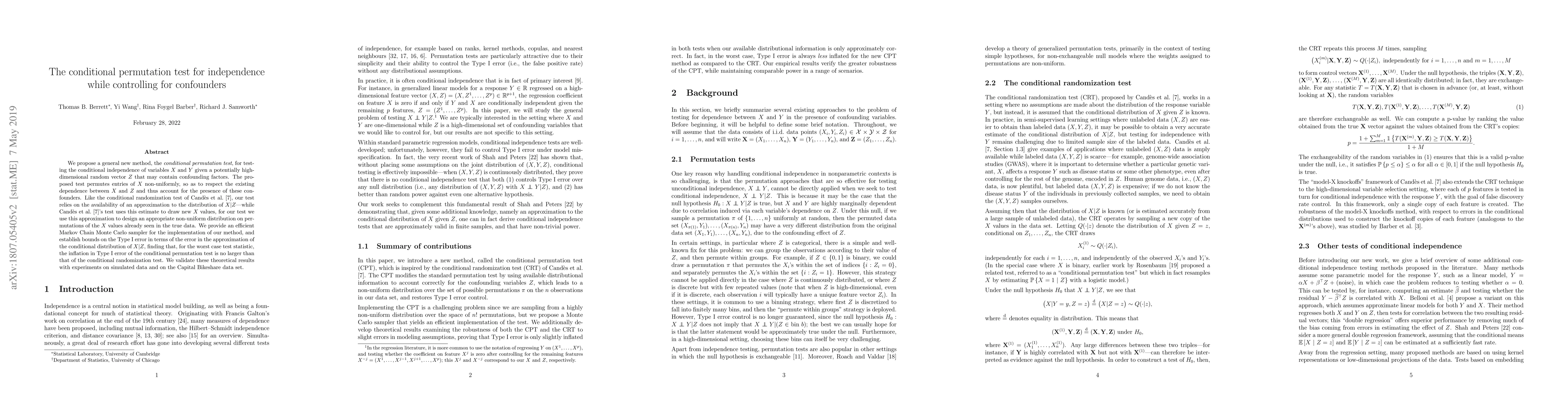 The paper introduces a conditional permutation test for assessing the independence of variables $X$ and $Y$ given a high-dimensional confounder vector $Z$, using a non-uniform permutation strategy to respect existing dependencies. The method is validated through theoretical bounds and empirical experiments on simulated and real data.
