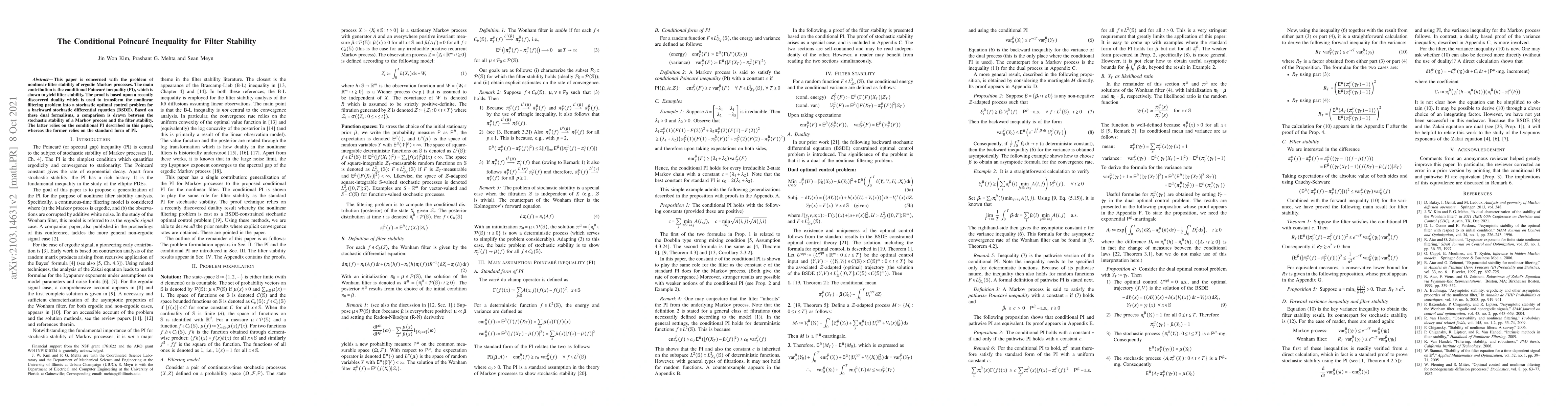 This paper is concerned with the problem of nonlinear filter stability of ergodic Markov processes. The main contribution is the conditional Poincar\'e inequality (PI), which is shown to yield filter stability. The proof is based upon a recently discovered duality which is used to transform the nonlinear filtering problem into a stochastic optimal control problem for a backward stochastic differential equation (BSDE). Based on these dual formalisms, a comparison is drawn between the stochastic stability of a Markov process and the filter stability. The latter relies on the conditional PI described in this paper, whereas the former relies on the standard form of PI.