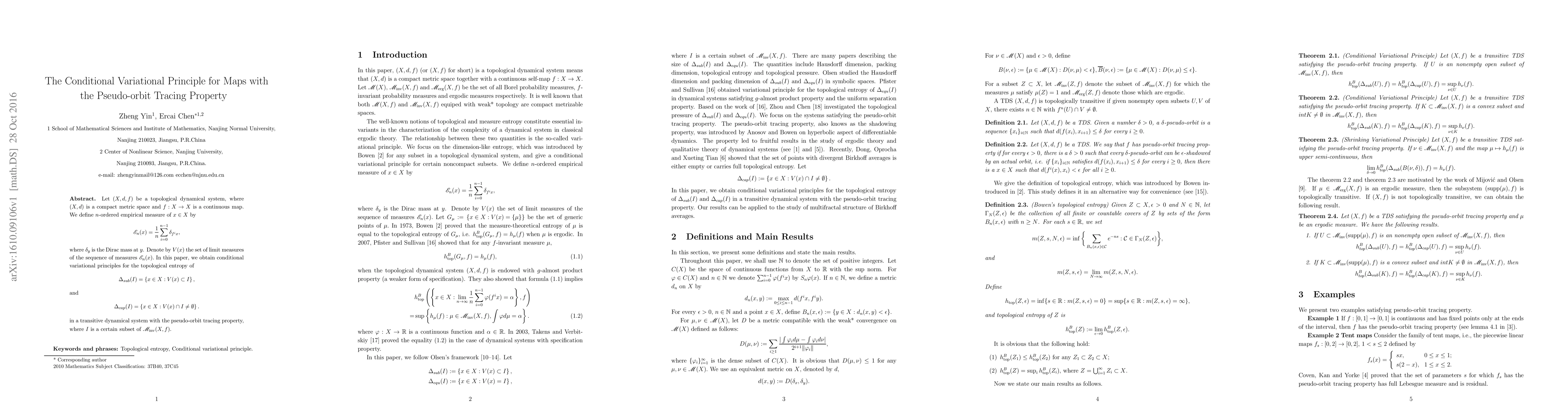 Let $(X,d,f)$ be a topological dynamical system, where $(X,d)$ is a compact metric space and $f:X\to X$ is a continuous map. We define $n$-ordered empirical measure of $x\in X$ by \begin{align*} \mathscr{E}_n(x)=\frac{1}{n}\sum\limits_{i=0}^{n-1}\delta_{f^ix}, \end{align*} where $\delta_y$ is the Dirac mass at $y$. Denote by $V(x)$ the set of limit measures of the sequence of measures $\mathscr{E}_n(x).$ In this paper, we obtain conditional variational principles for the topological entropy of \begin{align*} \Delta_{sub}(I)=\left\{x\in X:V(x)\subset I\right\}, \end{align*} and \begin{align*} \Delta_{cap}(I)=\left\{x\in X:V(x)\cap I\neq\emptyset \right\}. \end{align*} in a transitive dynamical system with the pseudo-orbit tracing property, where $I$ is a certain subset of $\mathscr M_{\rm inv}(X,f)$.
