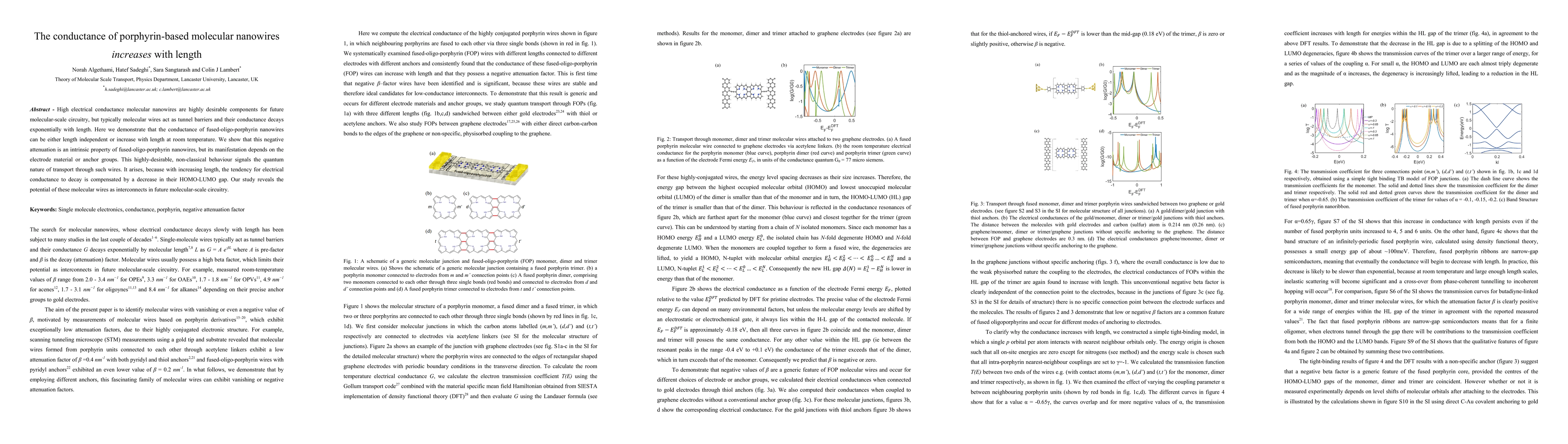 This study demonstrates that fused-oligo-porphyrin nanowires exhibit unusual conductance properties, with their electrical conductance either remaining constant or increasing with length, contrary to typical exponential decay. This behavior is attributed to a decrease in the HOMO-LUMO gap with length and varies depending on electrode materials or anchor groups, indicating quantum-level transport.