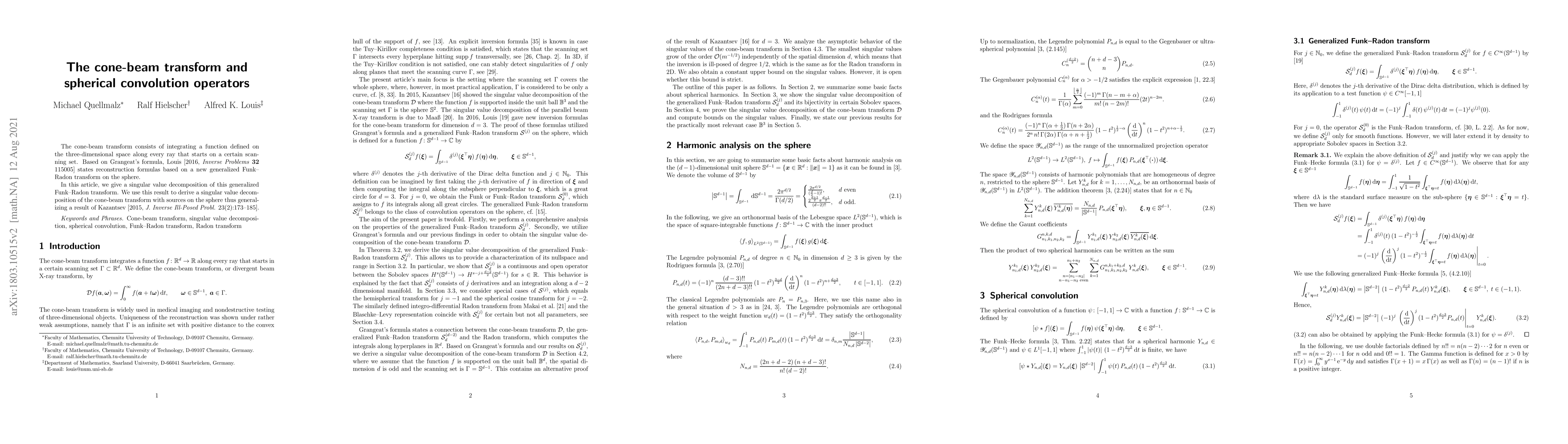This paper presents a singular value decomposition of the generalized Funk-Radon transform on the sphere, which is then applied to derive a similar decomposition for the cone-beam transform with spherical sources, extending previous work by Kazantsev.