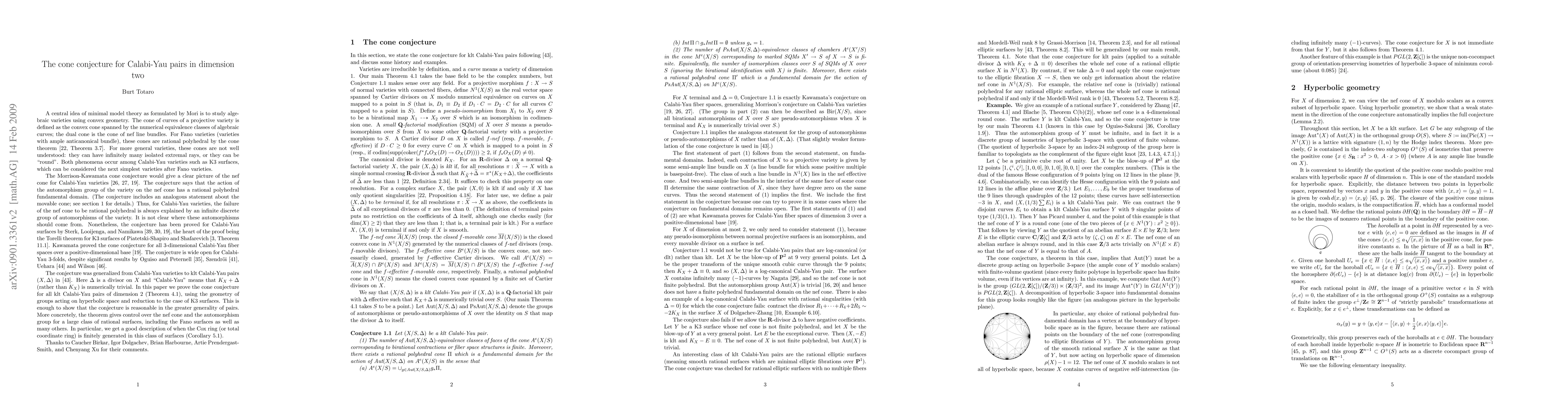 We prove the Morrison-Kawamata cone conjecture for klt Calabi-Yau pairs in dimension 2. That is, for a large class of rational surfaces as well as K3 surfaces and abelian surfaces, the action of the automorphism group of the surface on the convex cone of ample divisors has a rational polyhedral fundamental domain. More concretely: there many be infinitely many curves with negative self-intersection on the surface, but all such curves fall into finitely many orbits under the automorphism group of the surface. The proof uses the geometry of groups acting on hyperbolic space. We deduce a characterization of the surfaces in this class with finitely generated Cox ring.